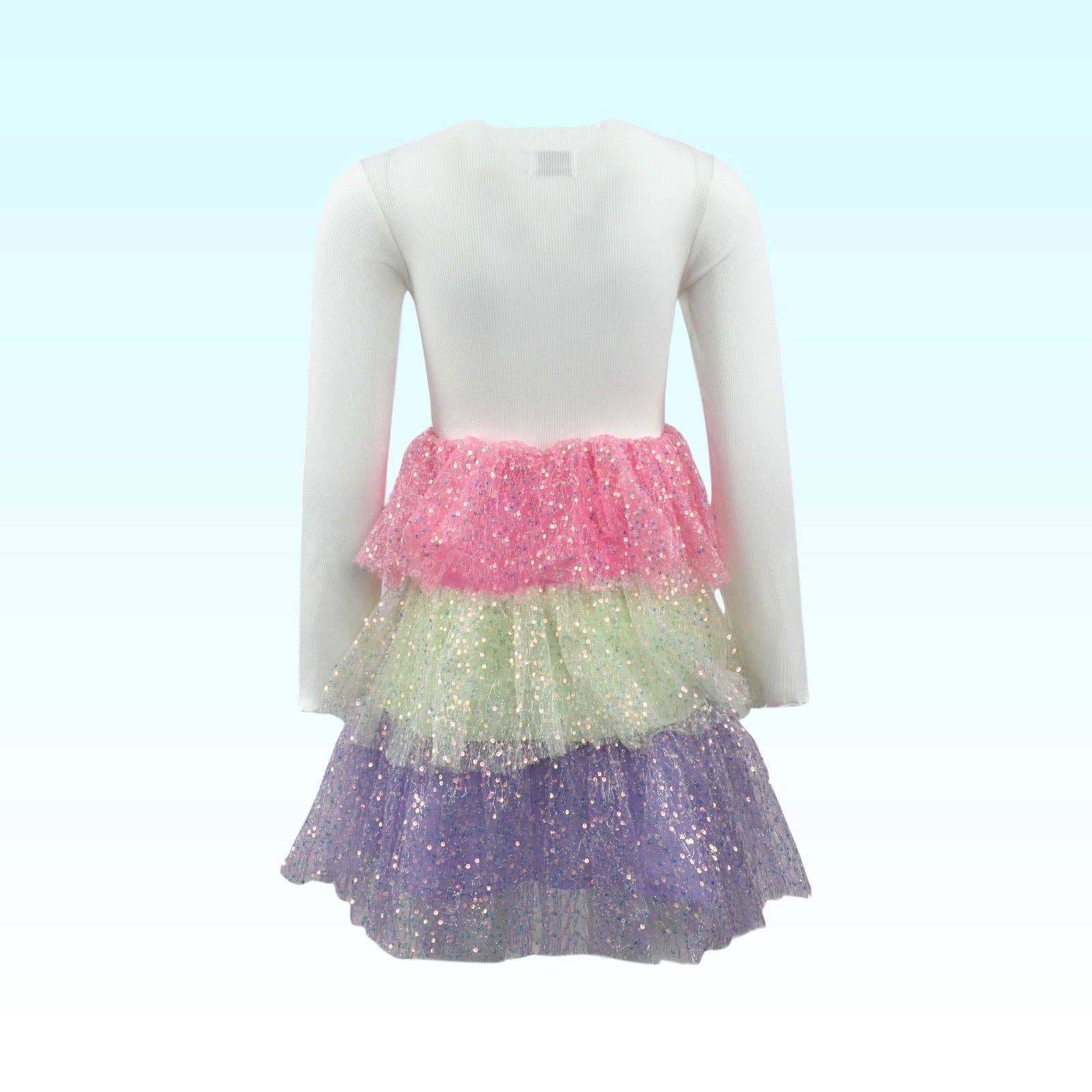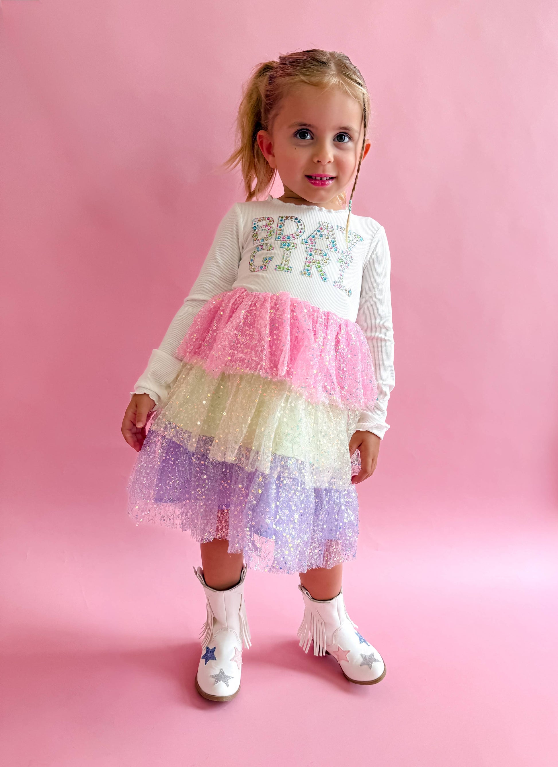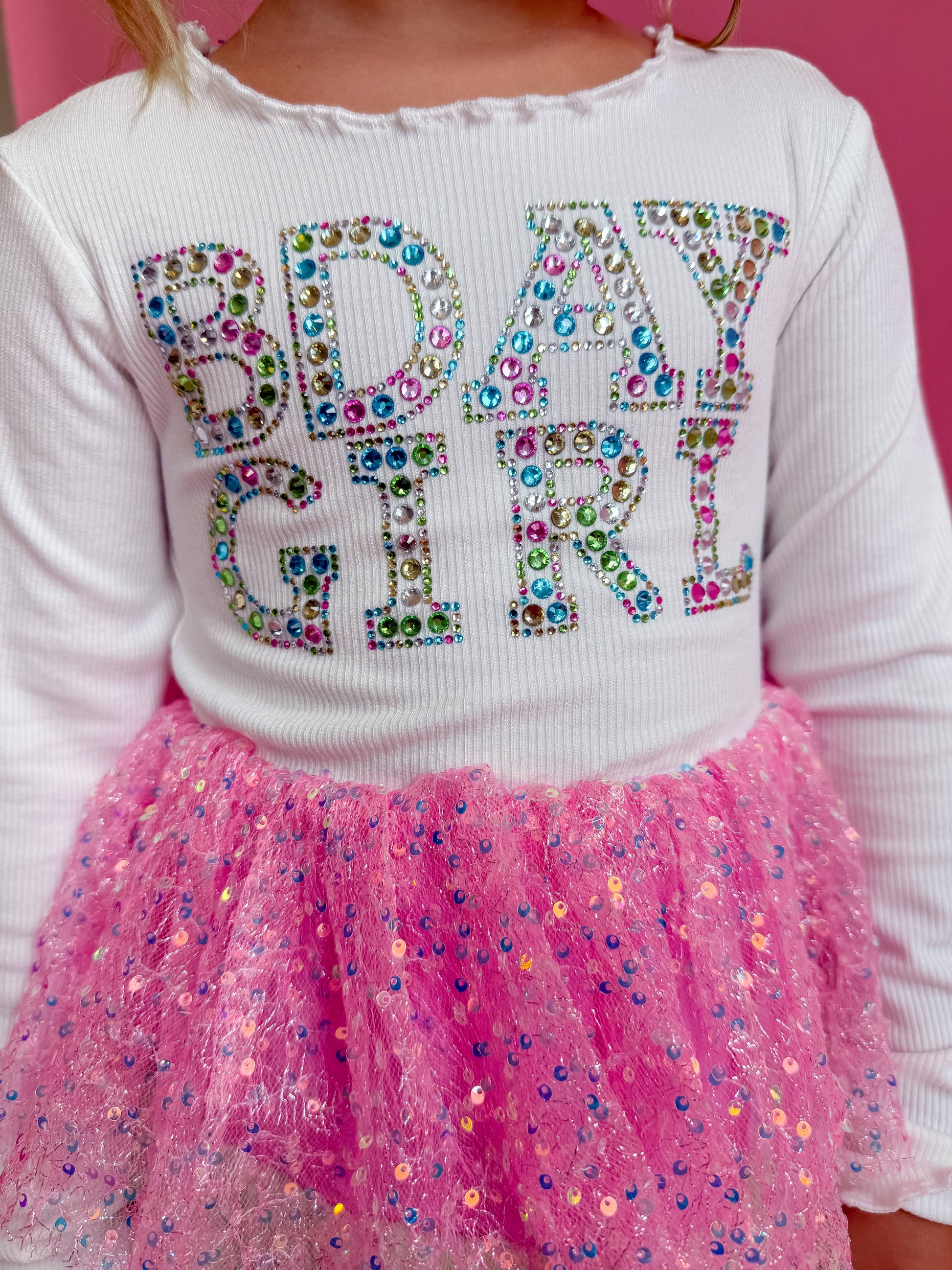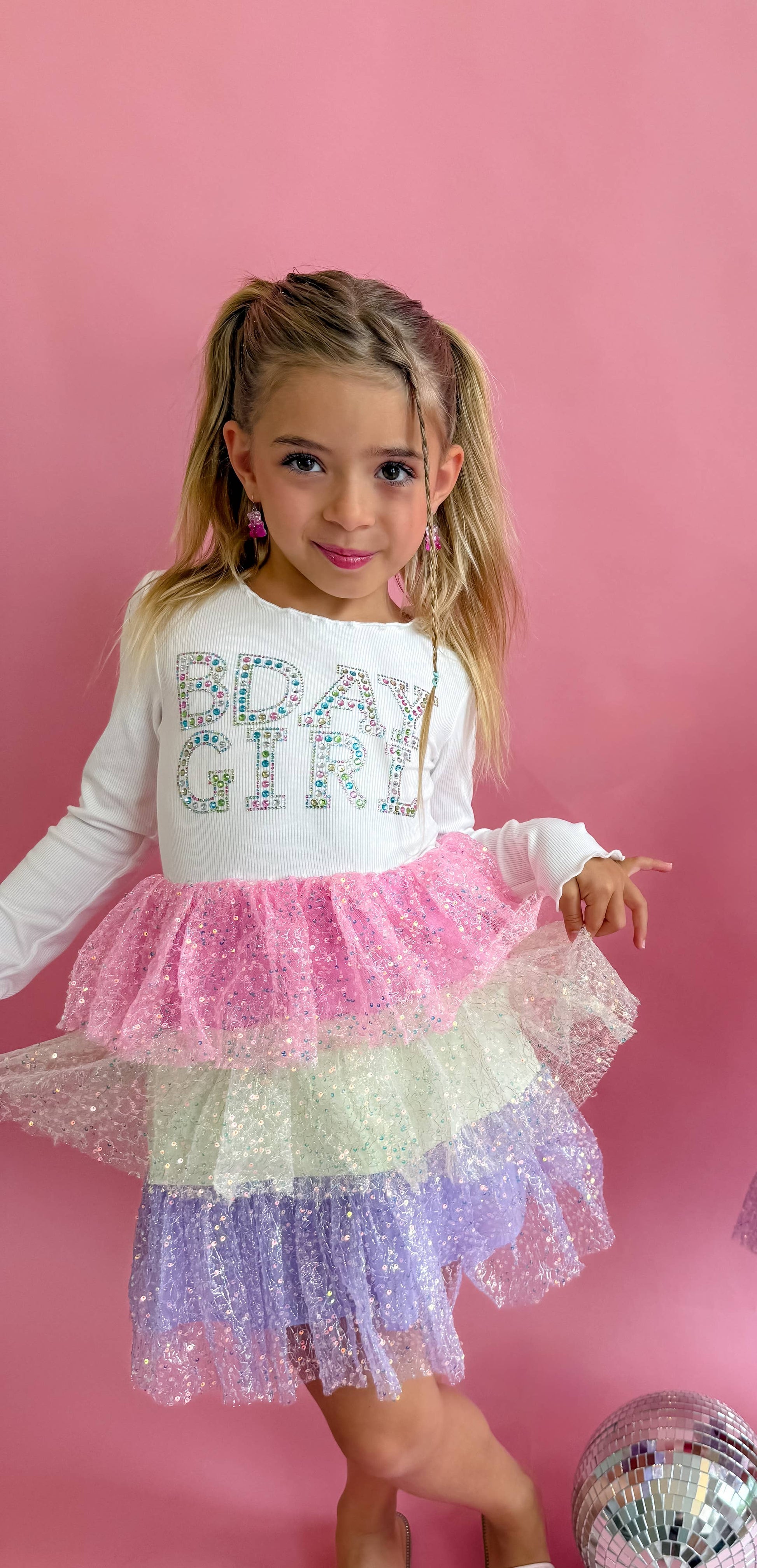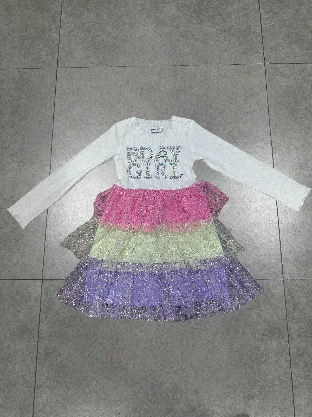 Make your birthday girl feel like a true princess with our Bday Girl Rhinestone Dress. This three-layered tulle dress is adorned with rhinestone gem stamping on the stretchy ribbed top, adding a magical sparkle to her special day. She'll feel extra special with the "bday girl" written on the dress, making it the perfect outfit for her birthday celebration.