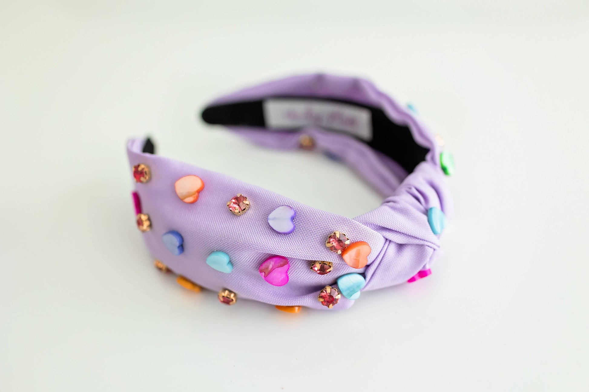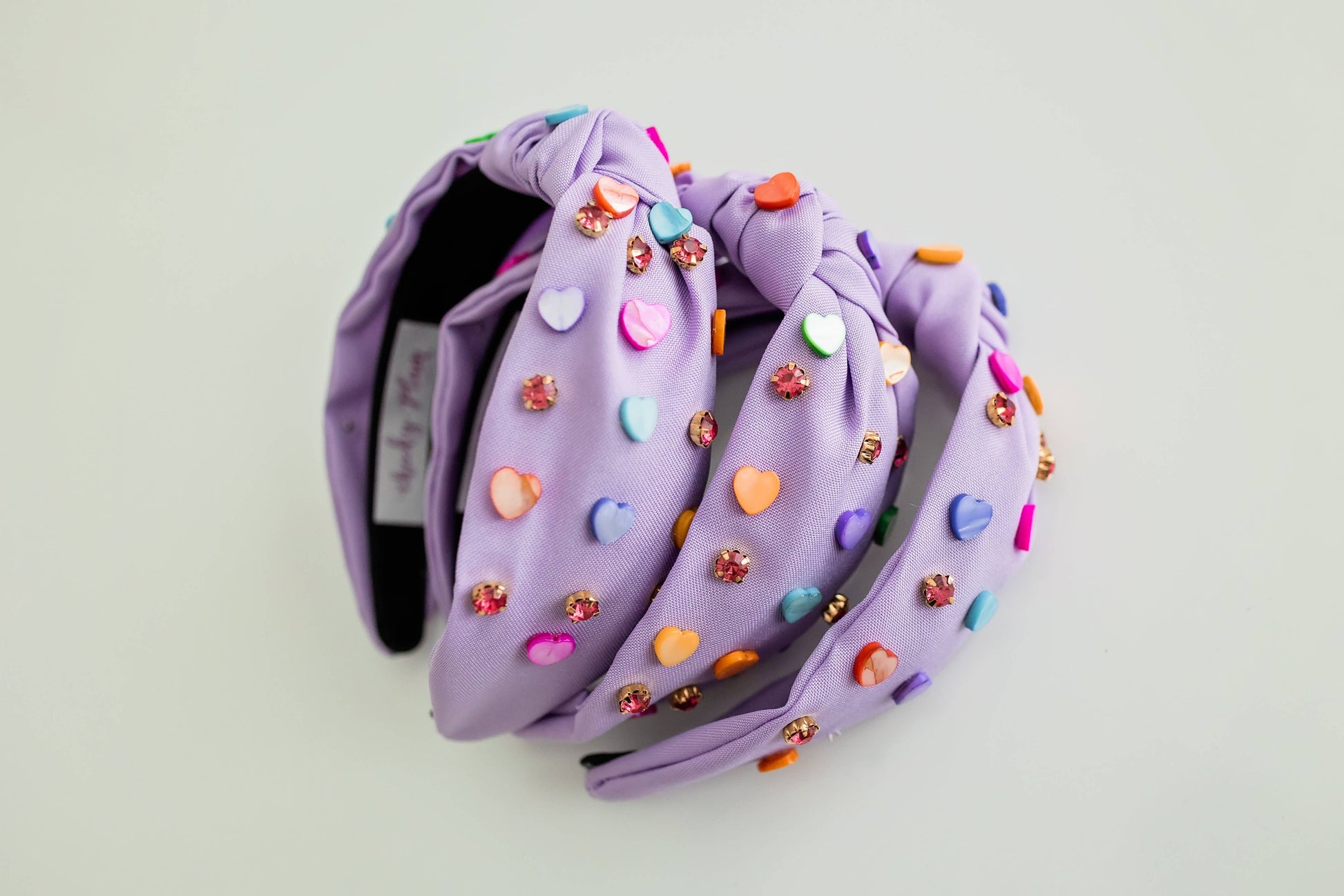Turn heads with this whimsical Lavender Loveburst headband! Crafted with beaded colored hearts and jeweled accents, it's sure to make a sparkly statement!