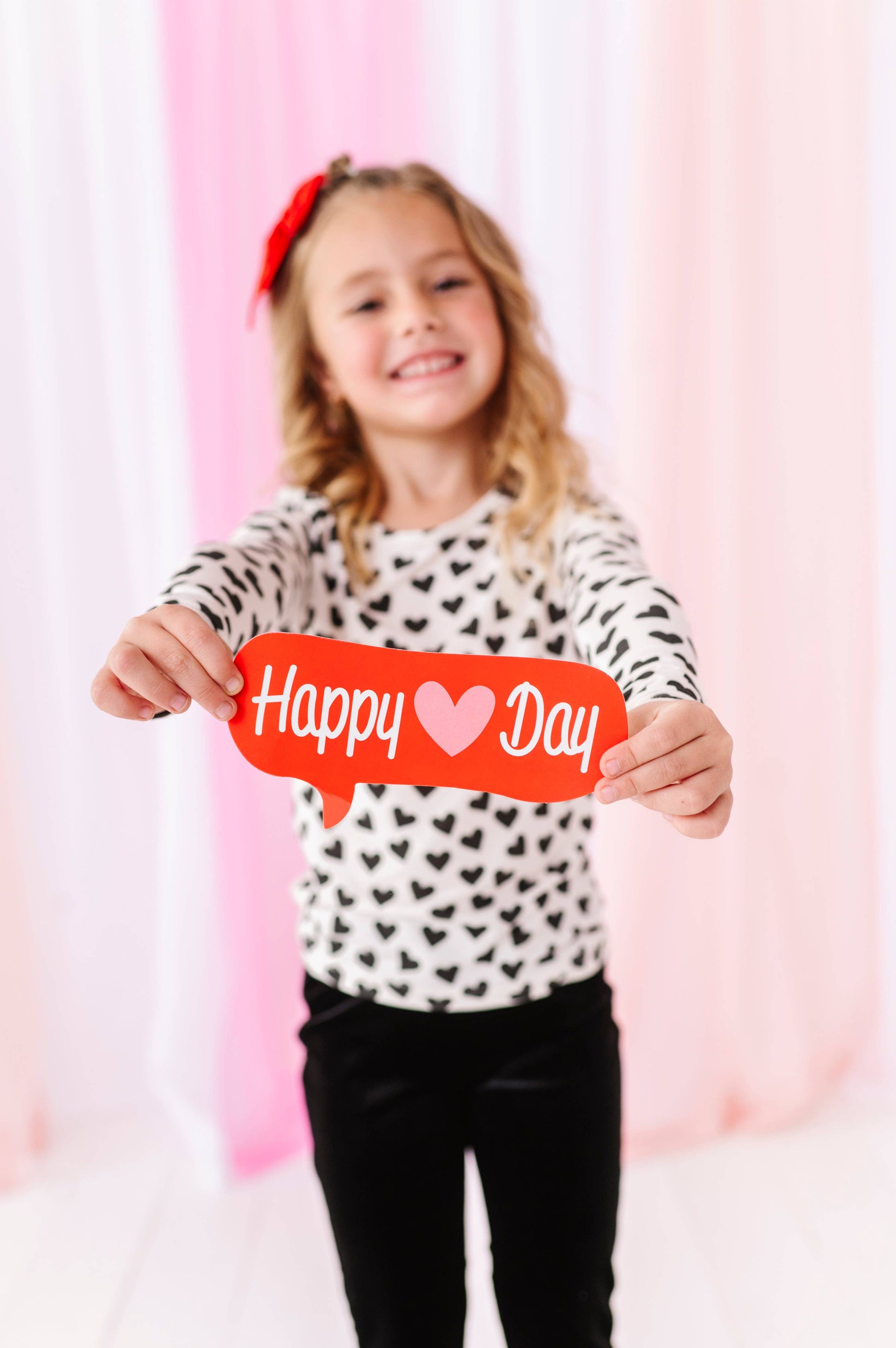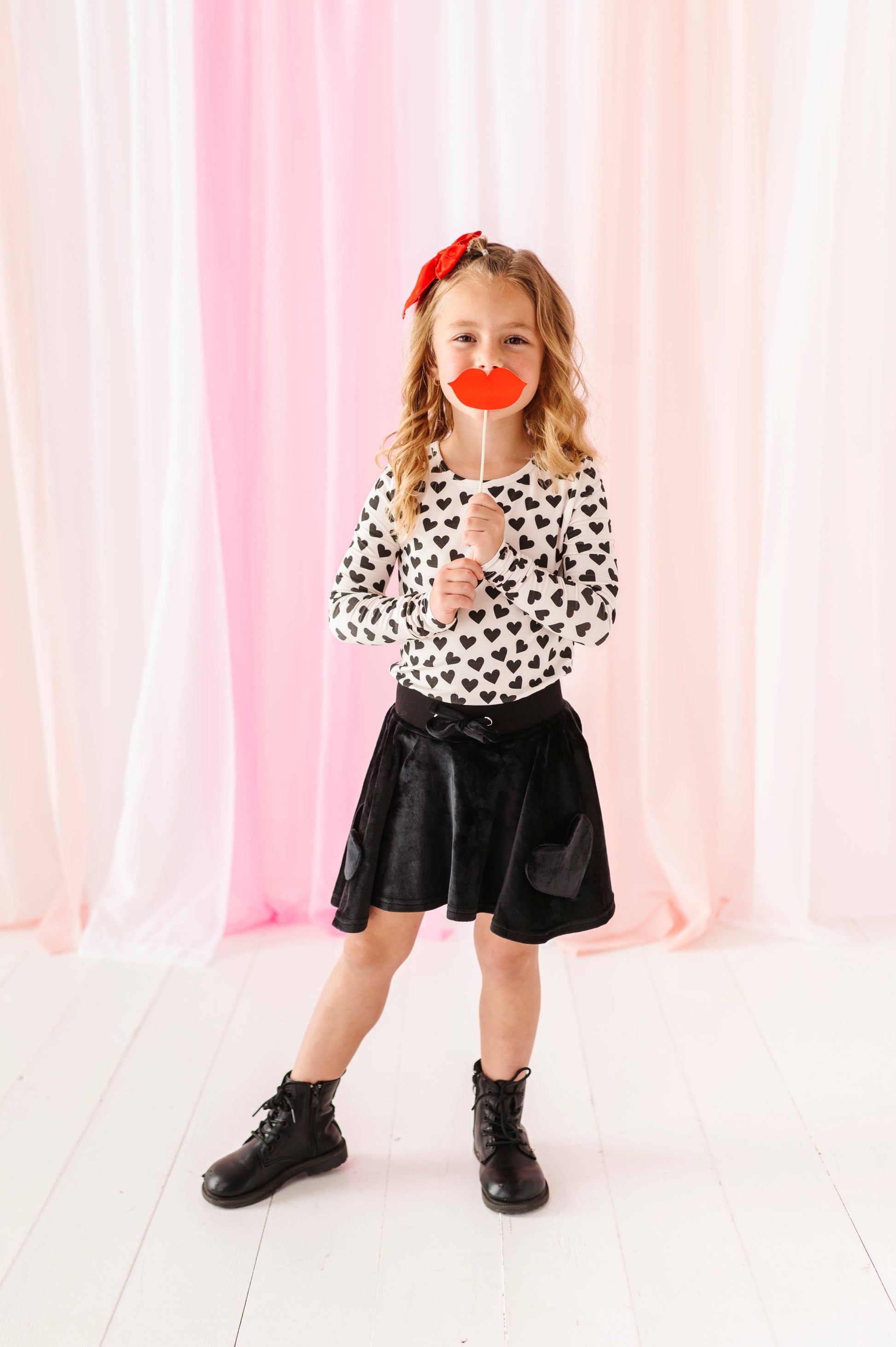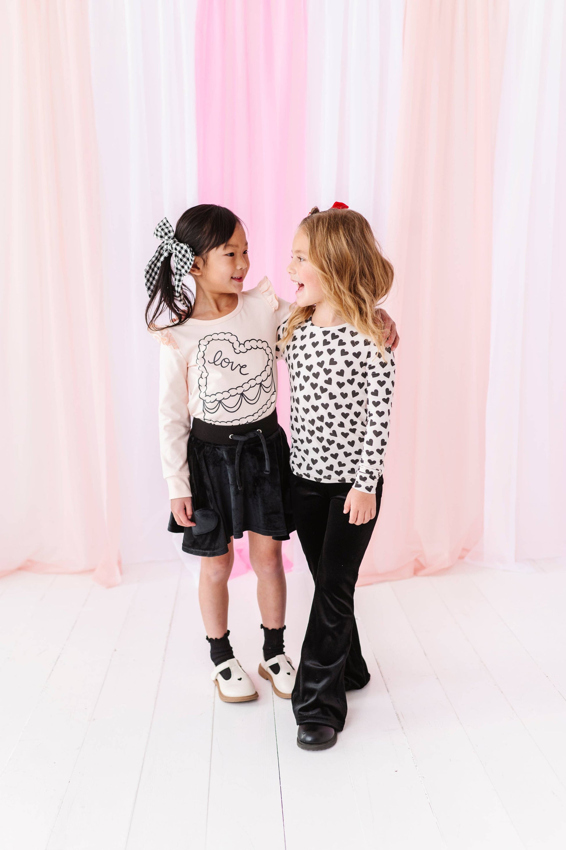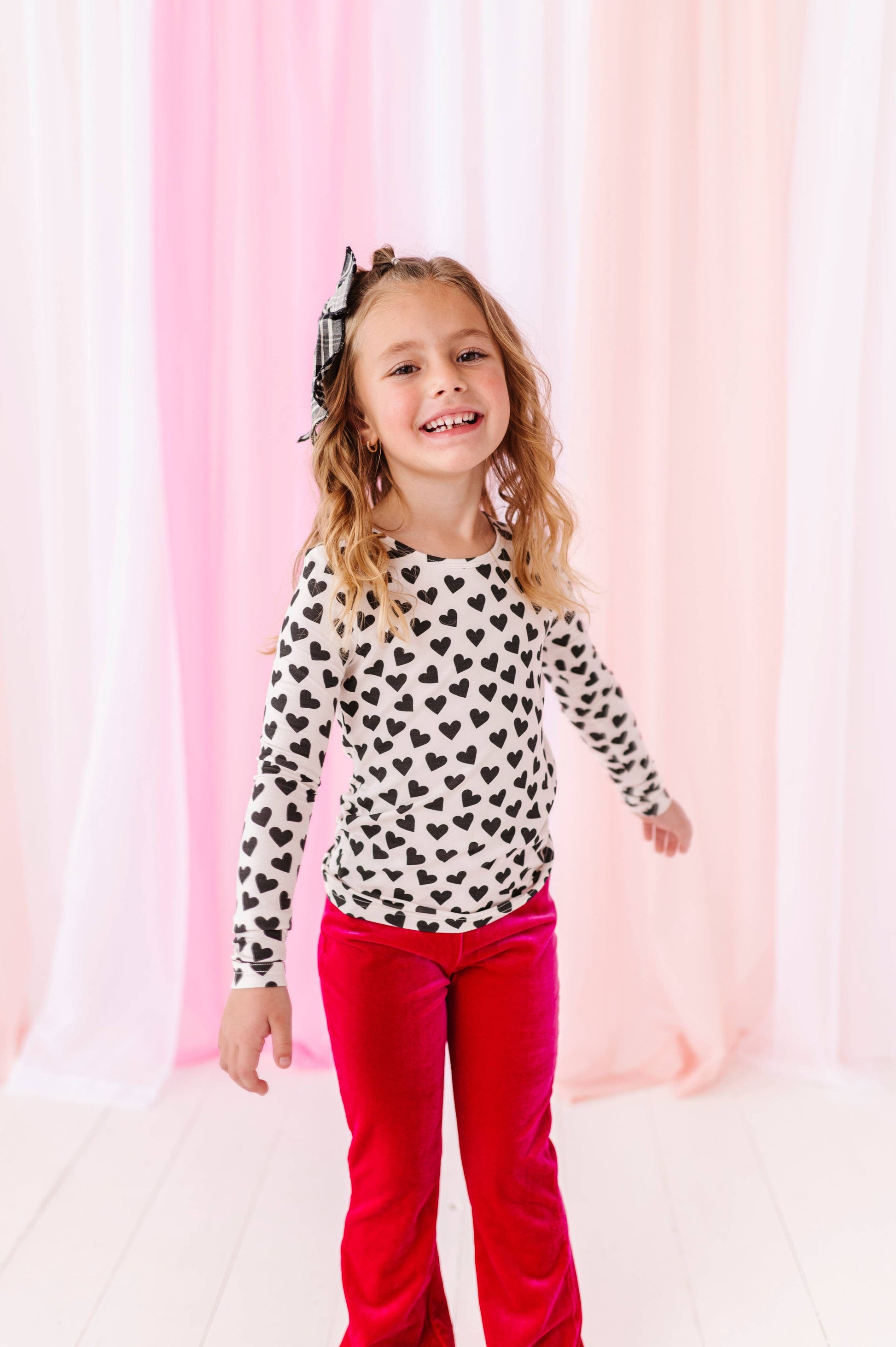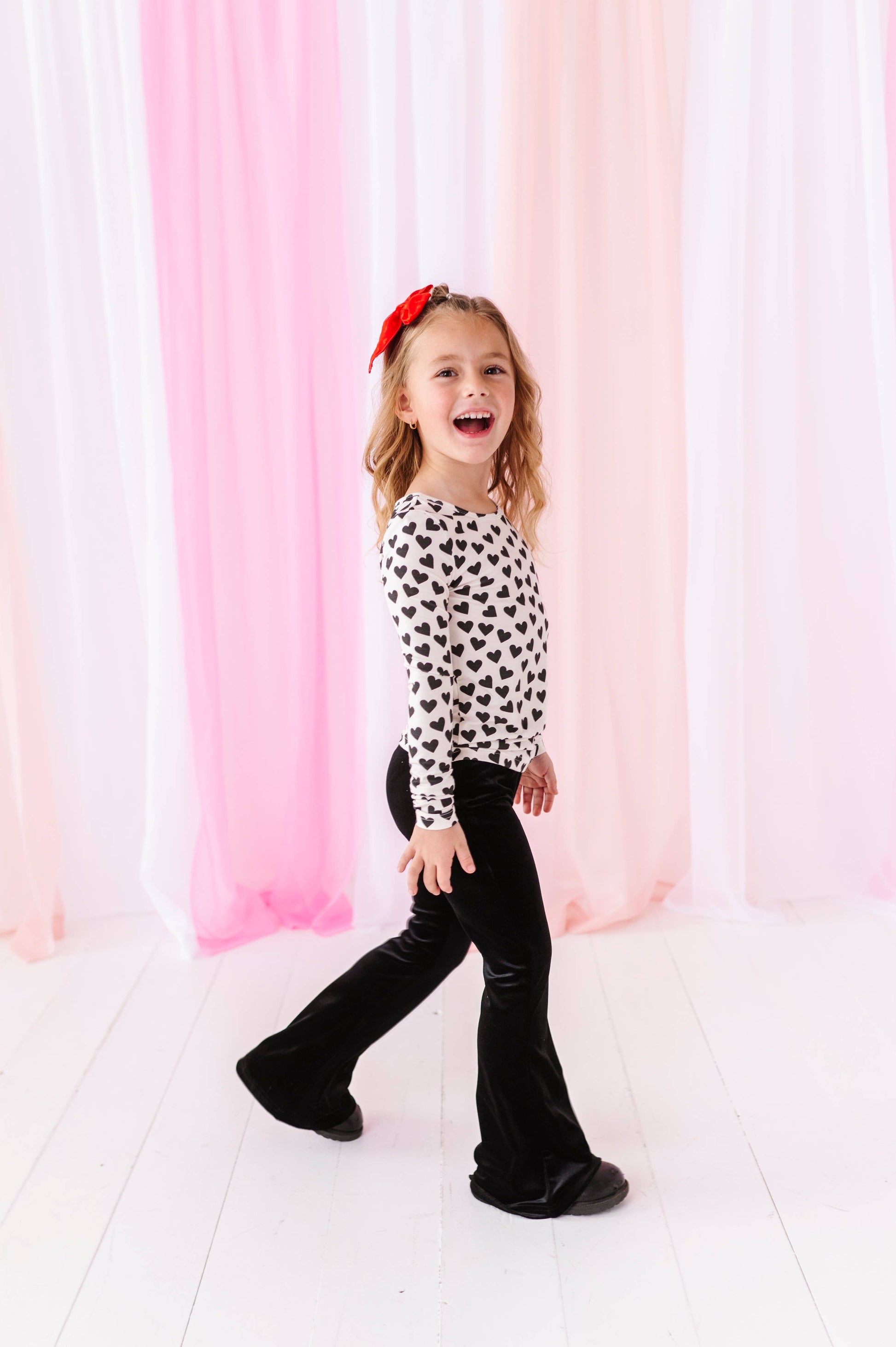 This style runs true to size with super soft fabric and a snug fit in the body and arms. This absolutely adorable t shirt is perfect for any time of the season but is absolutely perfect for Valentine’s Day! It’s so timeless and classy and even better, match it with our hot pink velvet flares!