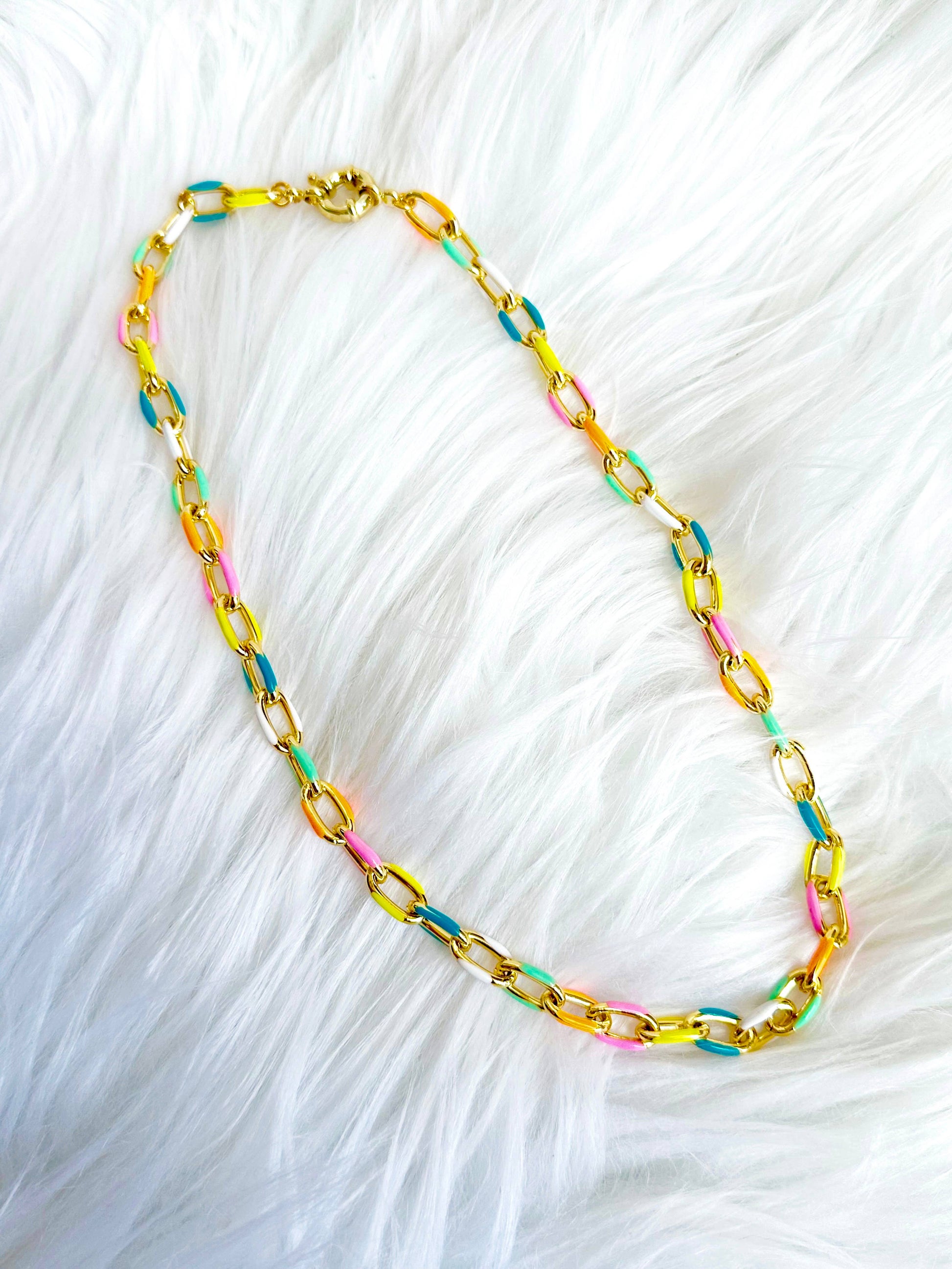 Colorful 18" enamel chain necklace with a gold clasp. A fun necklace that will compliment so much! *Hypoallergenic and nickel free.