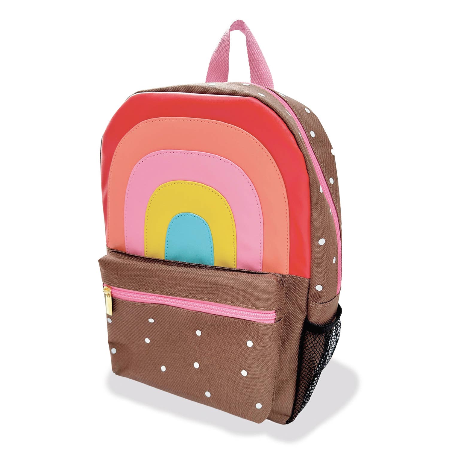 Get out and about in colourful style with our fun rainbow rucksack! In a gorgeous brown spotted fabric, with a bright rainbow, this rucksack is fully lined in our sweet heart print and features a carry handle, a front pocket, bottle netting and adjustable straps.