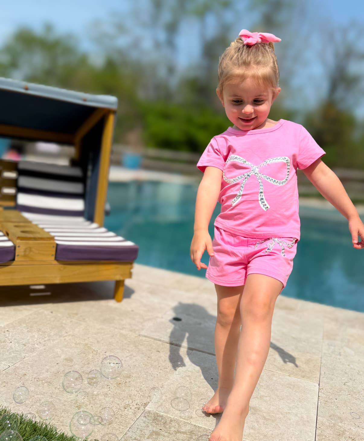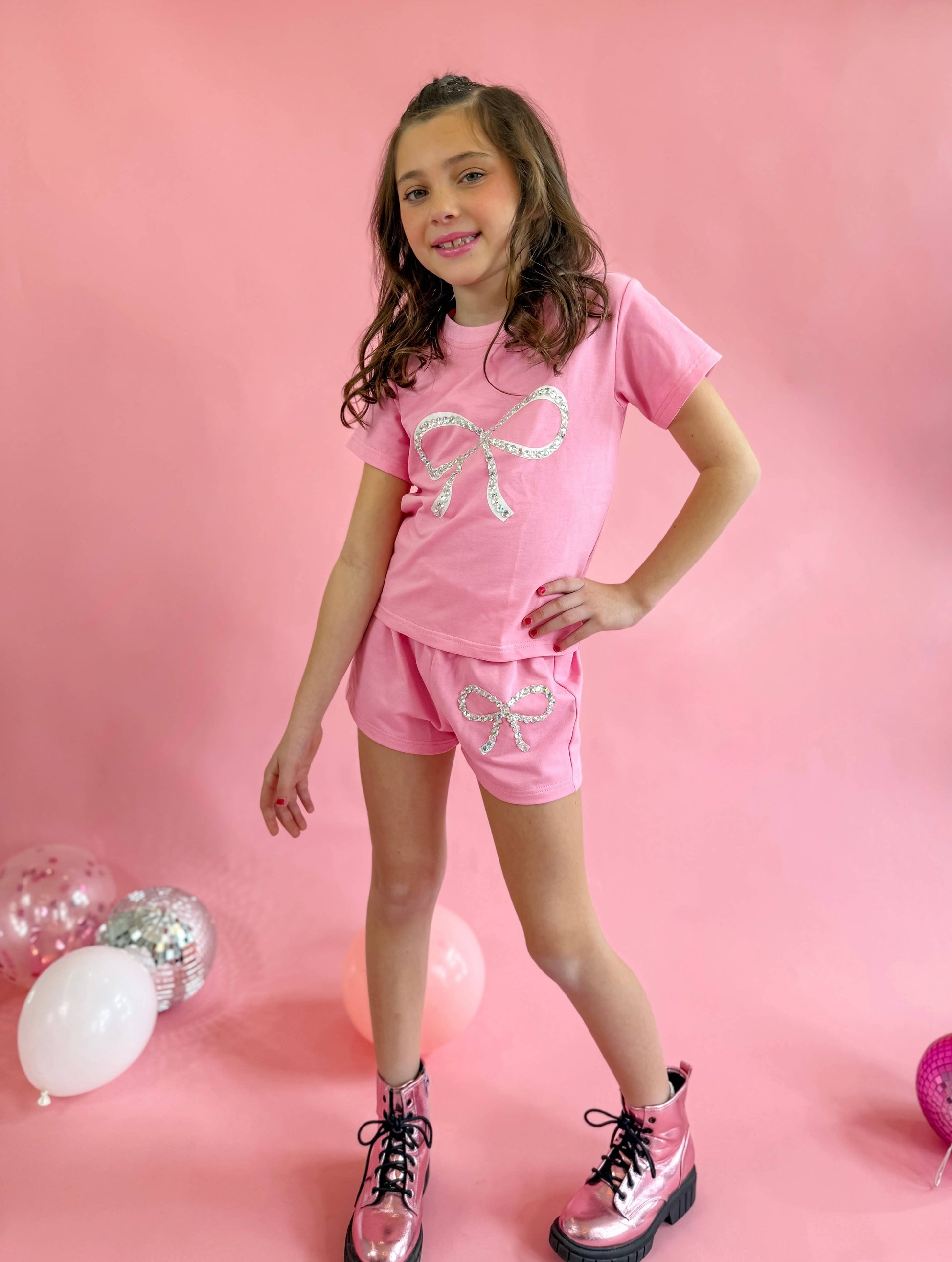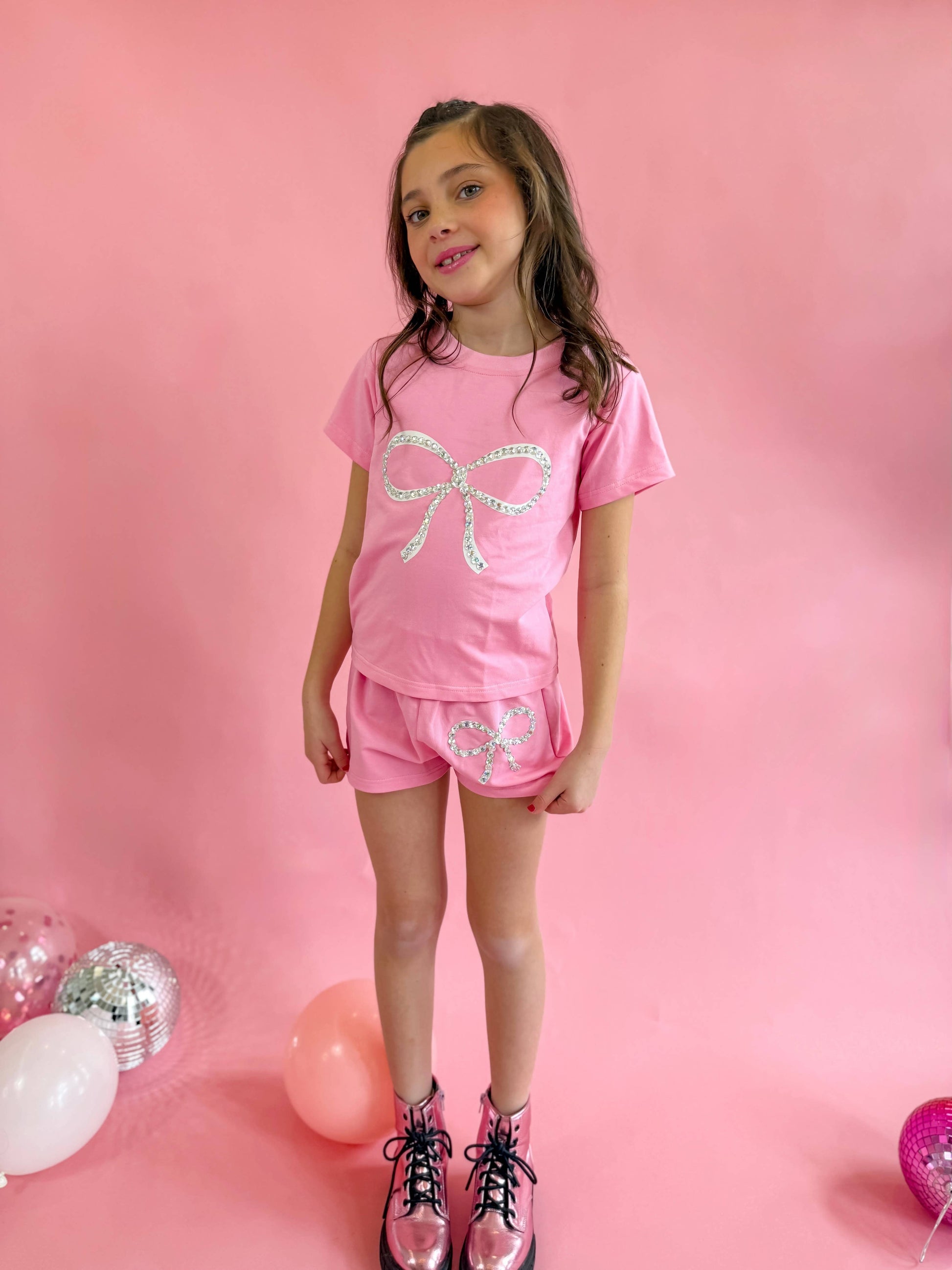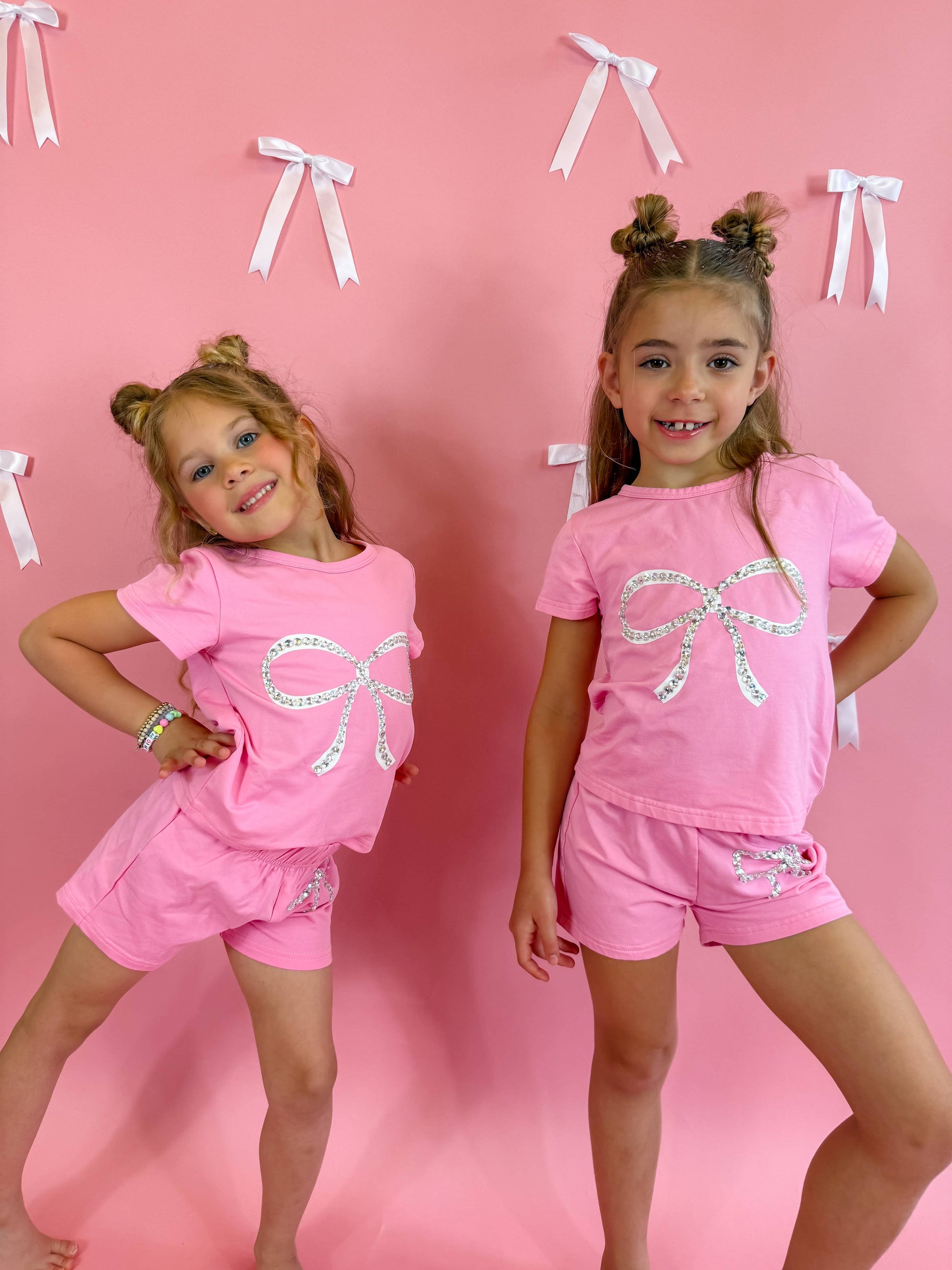 The most comfortable t-shirt and short set with a cute crystal bow 🎀 perfect for spring & summer! The gems are carefully hand sewn on top of the bow for that extra sparkle!