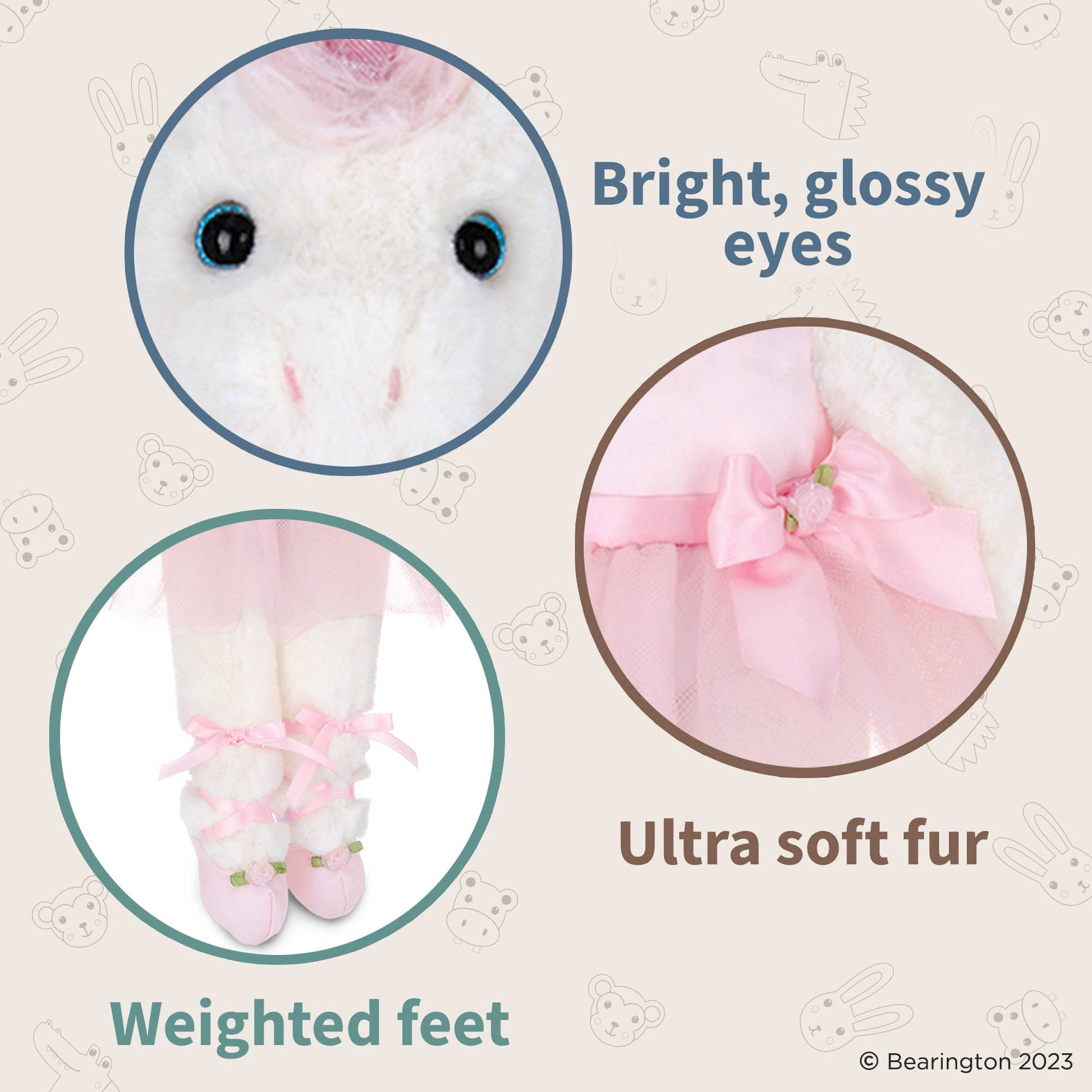 This surface washable, soft plush is the perfect ballerina toy for aspiring dancers. Watch your child twirl and pirouette with their new friend, a cherished keepsake for years to come. Ideal for ballet enthusiasts and unicorn plush lovers alike! CUDDLY: Gift the perfect cuddly companion! Our unicorn plush toy is snuggle-sized and makes a beautiful room accent. Its huggable body and adorable features make it your go-to cuddle buddy. Also, explore our ballet gifts with ballerina stuffed animals like the ballerina bunny. Graceful and soft, they're ideal for ballet lovers or anyone wanting a cute cuddle buddy.