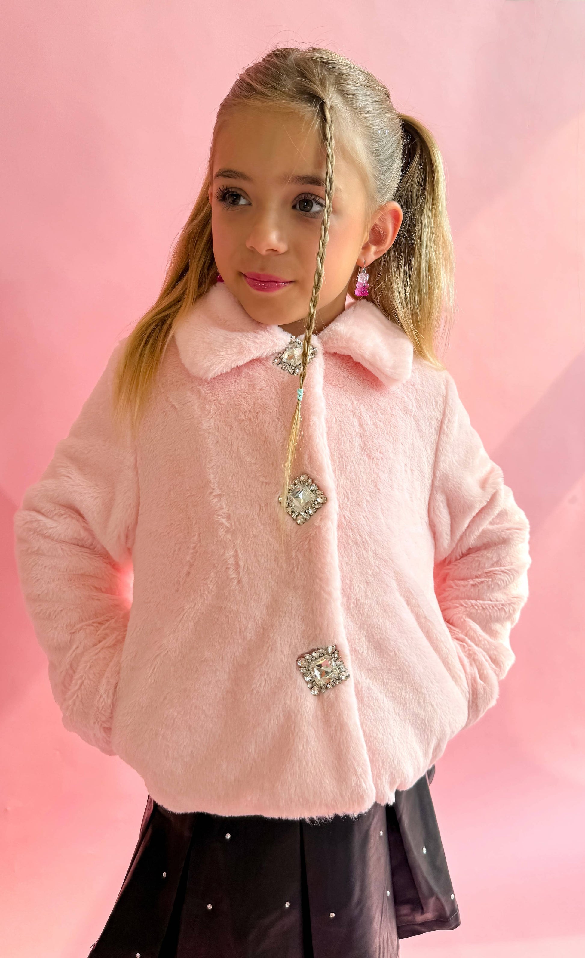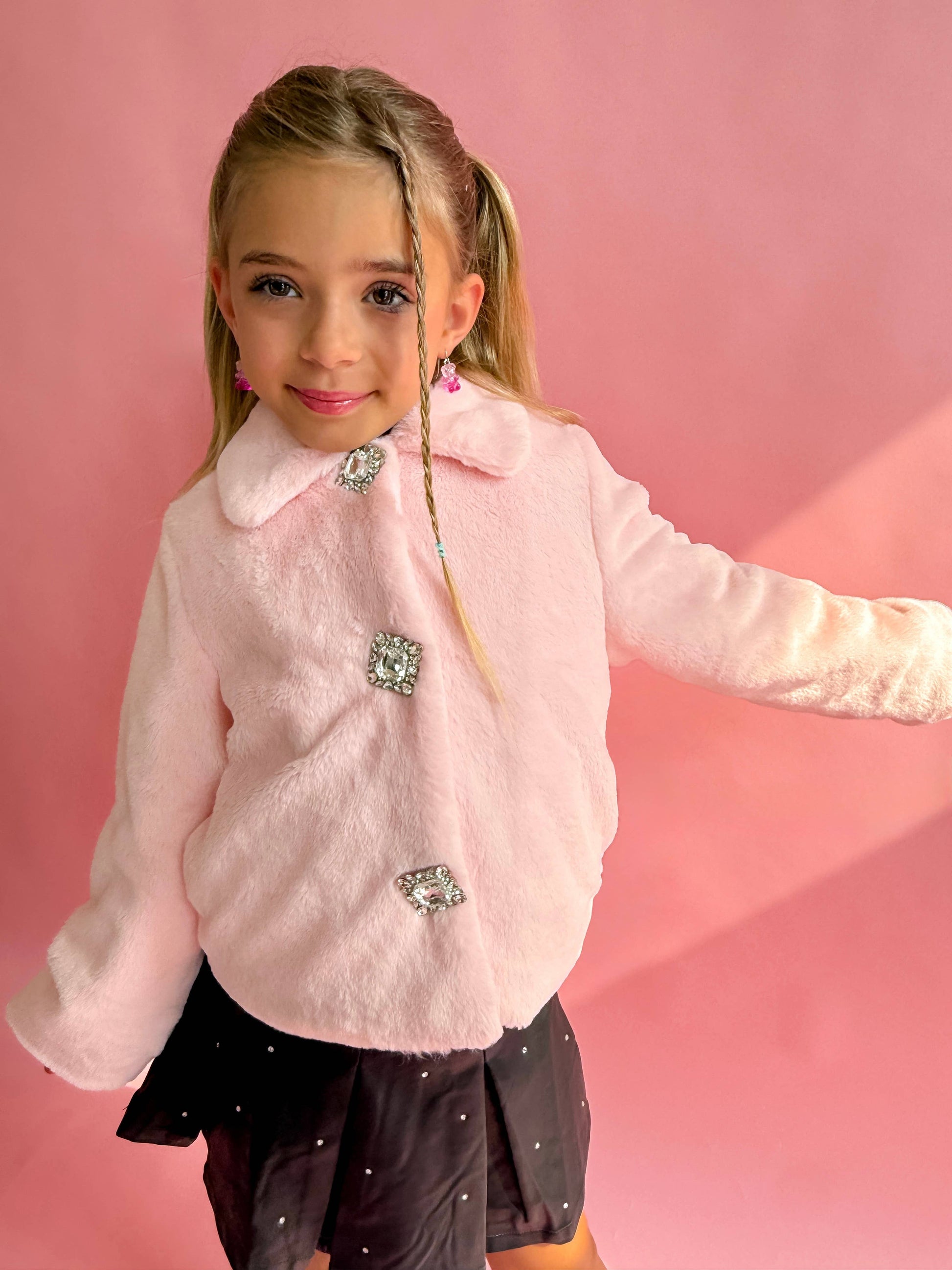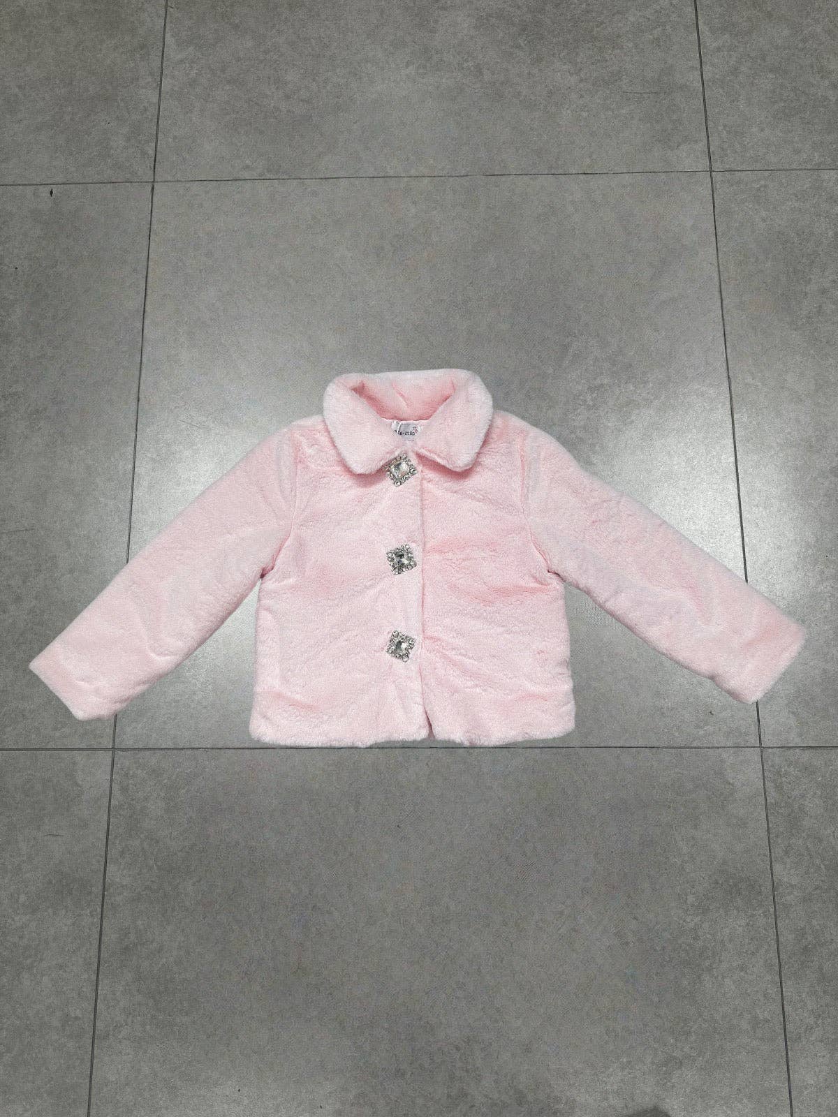 Introducing our Faux Fur Gem Jacket, the perfect winter jacket for your little girl. Crafted with soft faux fur, this jacket will keep her warm and comfortable. The gem buttons add a touch of elegance and charm.
