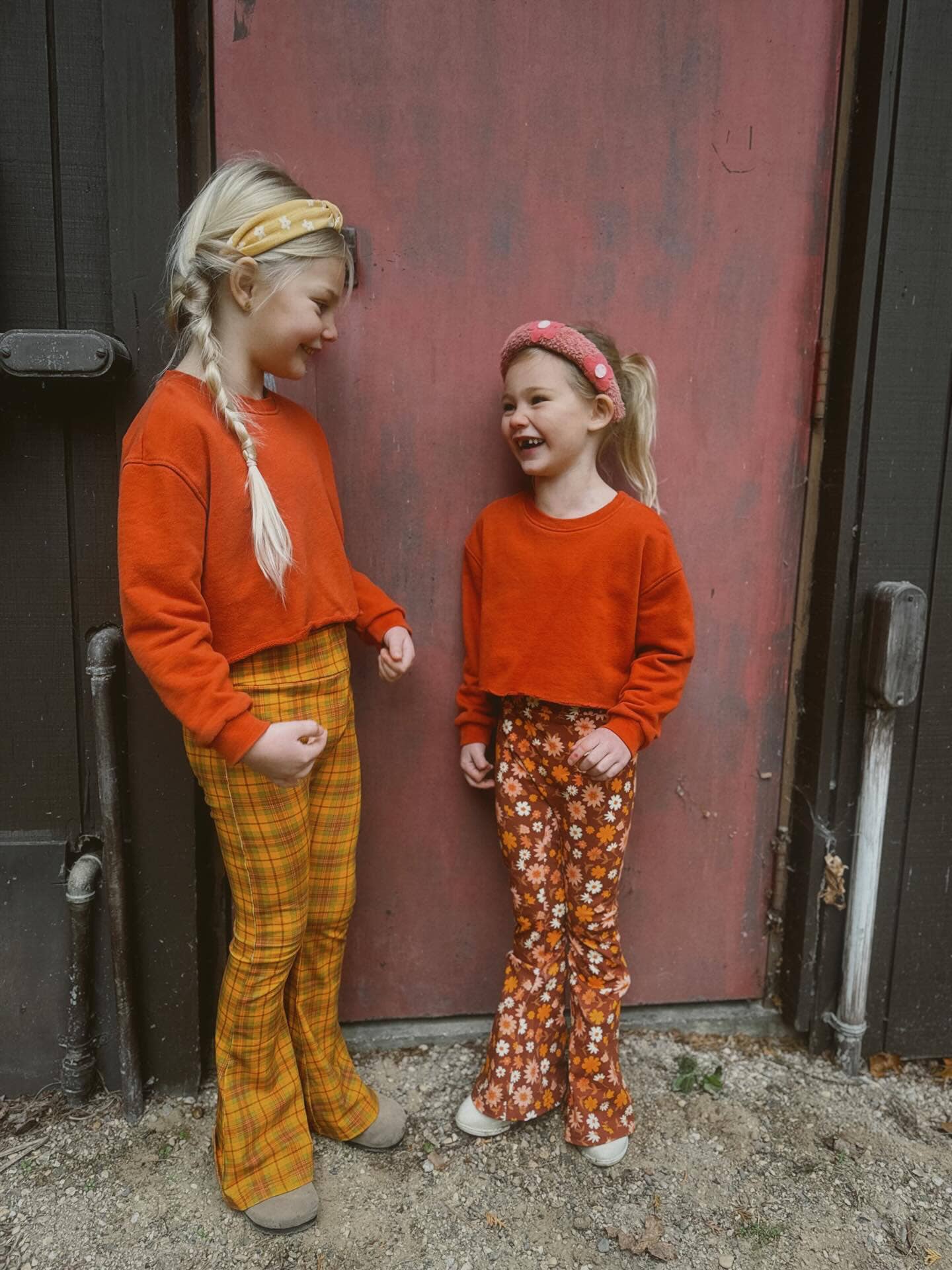 Show her retro spirit with these fun plaid bell bottoms. Pair these fun bell bottom pants with their favorite graphic tee or our solid color ruffle shirts.