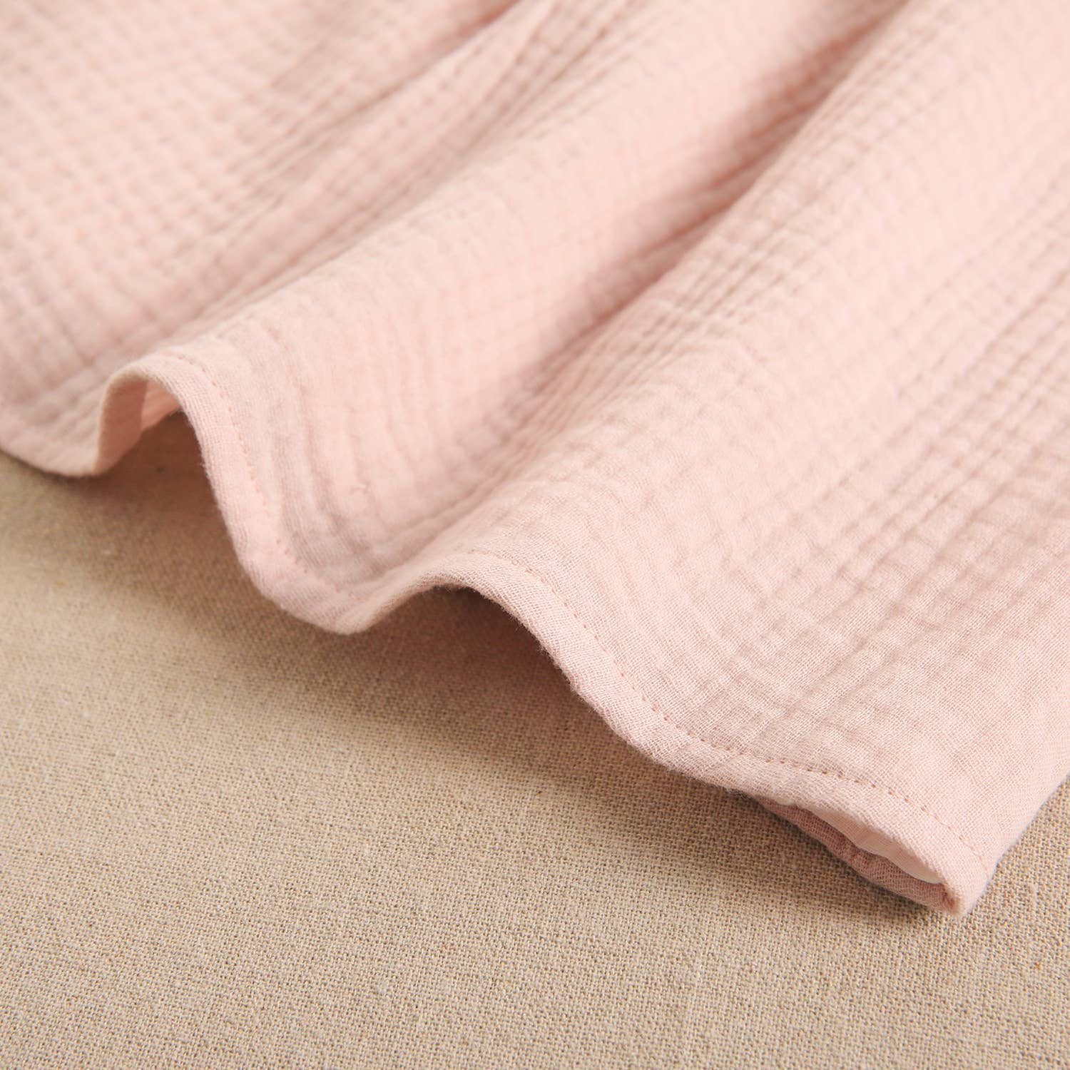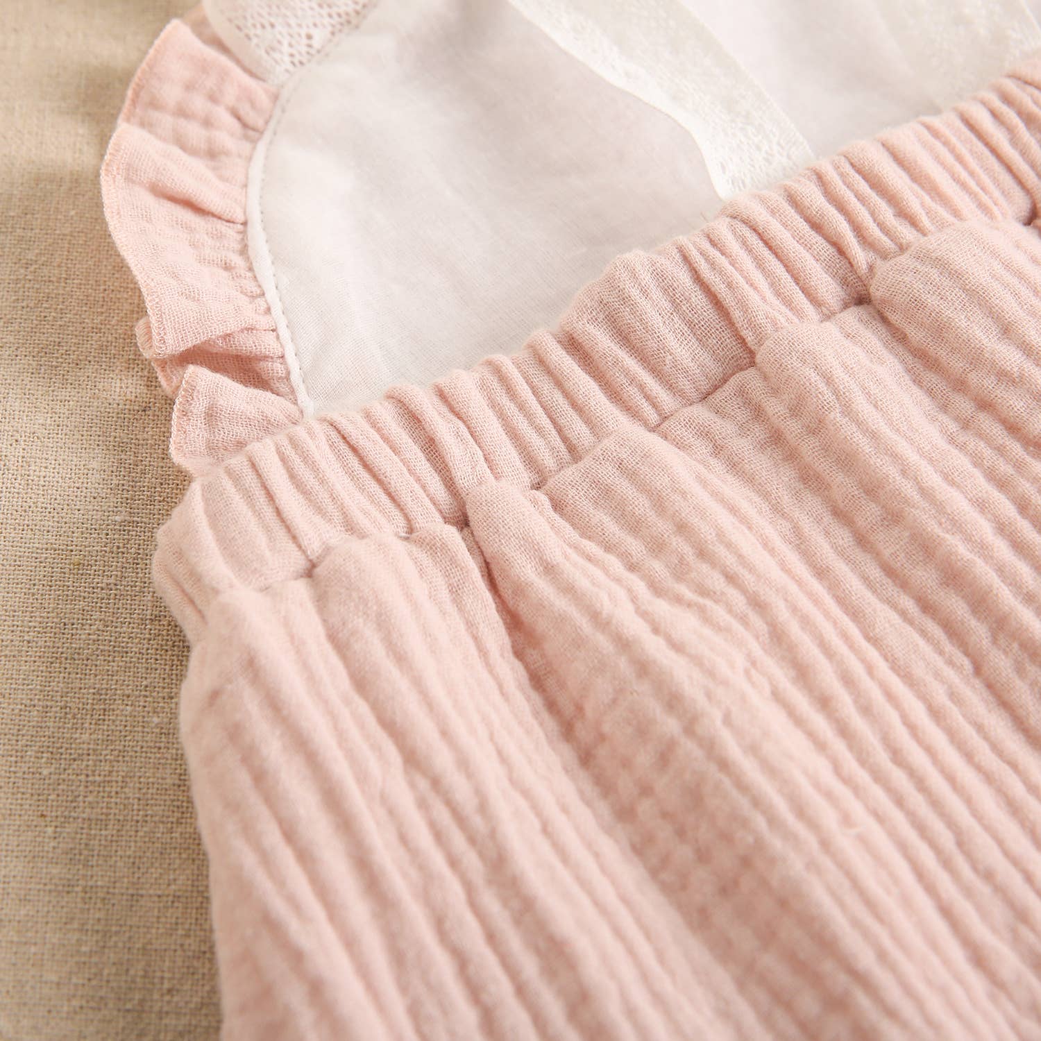 Girl's strappy dress with bambula fabric in pale pink. Embroidered lace straps in natural color, adjustable with lacing. White leaf embroidery on the chest. Open back regulated by the straps. Elastic rubber waistband. Skirt with a wide and flowing flight. Double cotton muslin fabric with a soft and very pleasant touch.