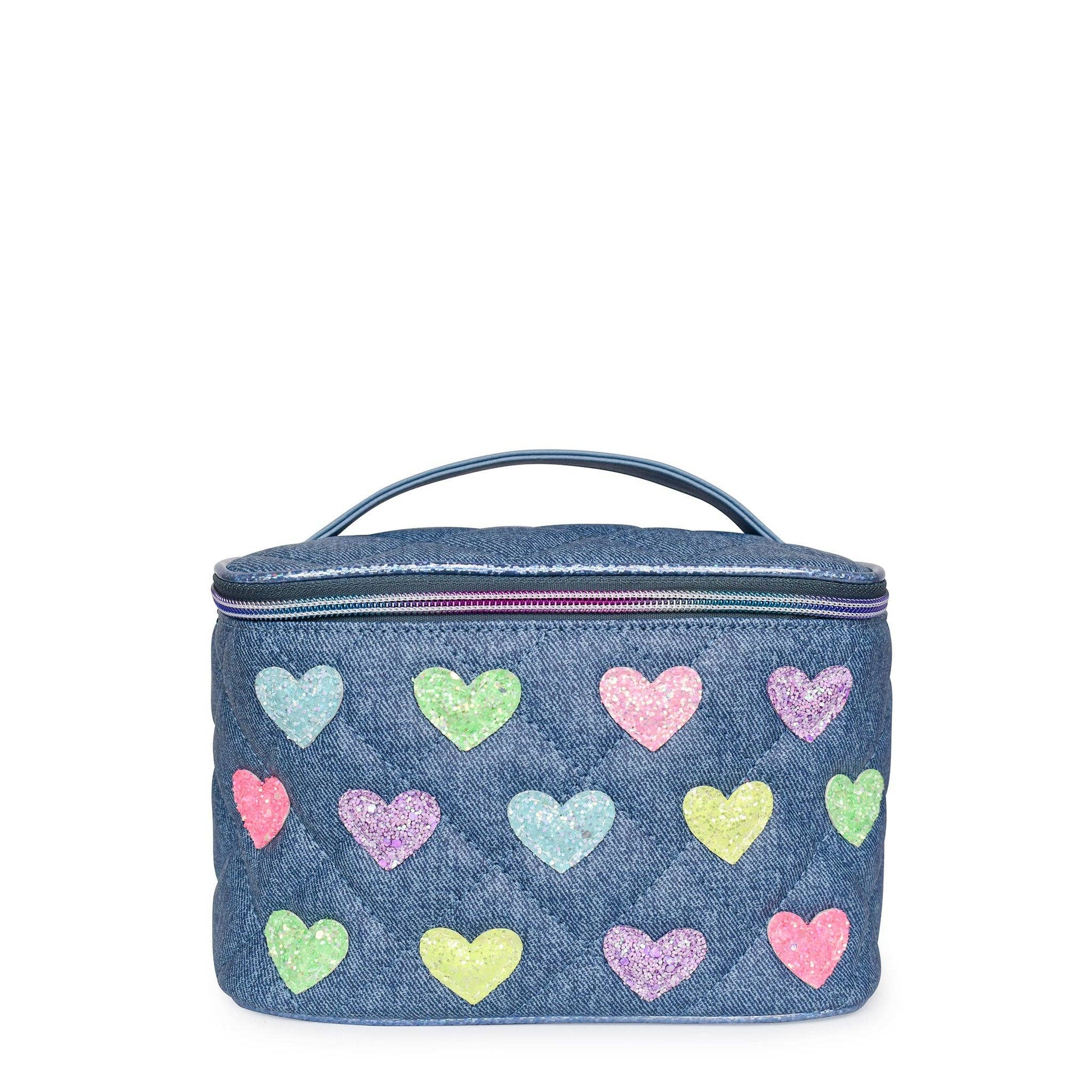 Turn your little one's denim dreams into a reality with this colorful fun-loving glam bag! Printed in an easy-to-clean realistic denim pattern and contrasted with bright multicolored glitter heart patches, this storage piece is sure to brighten up their days.