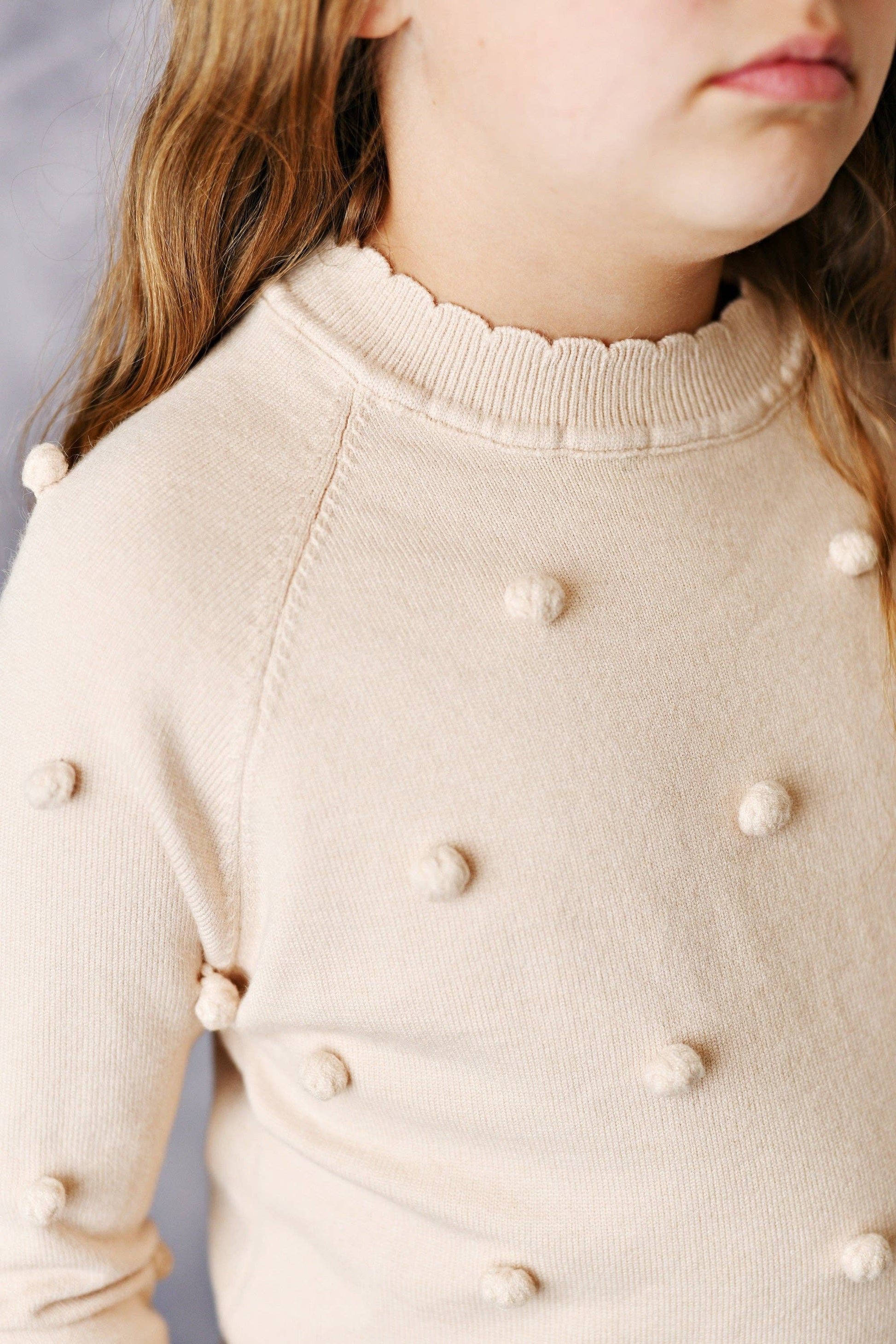 Kids Cream Beige Pom Pom Fall Winter Crew Neck Sweater
