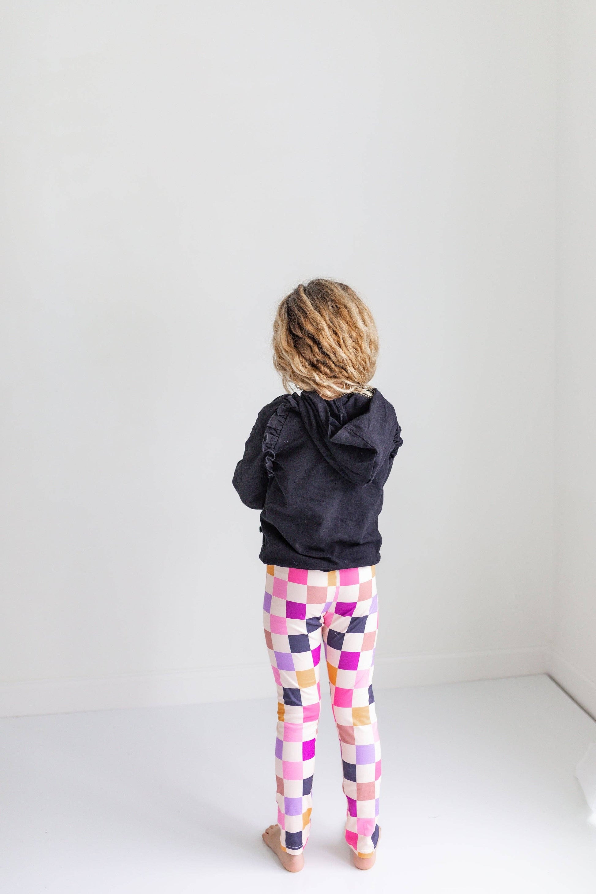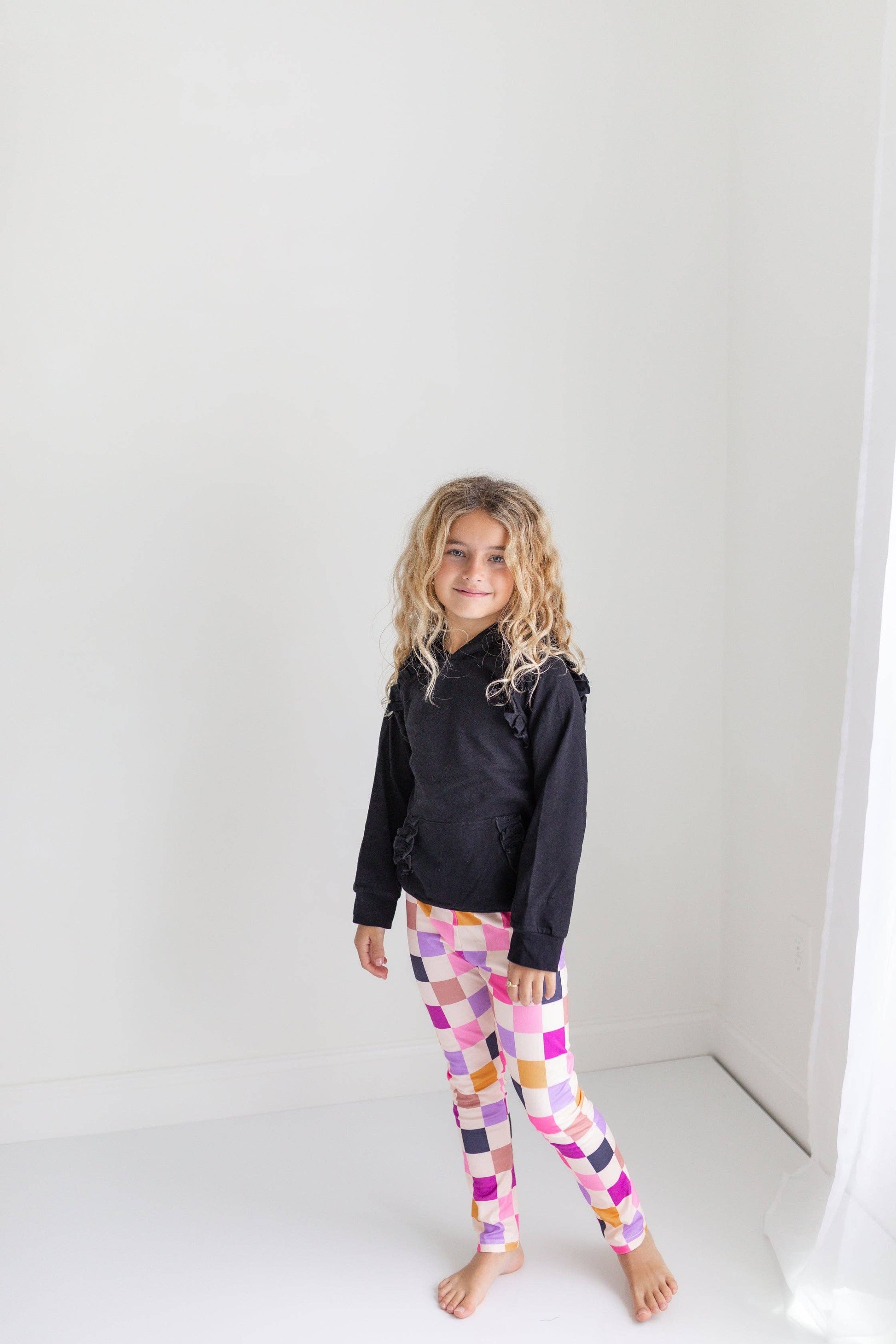 This girls two piece set includes a dark gray charcoal ruffle hooded top with a front ruffle pocket and beautiful multi color checkered leggings. A great outfit for back to school and the Perfect loungewear for snuggly Fall and Winter Days!
