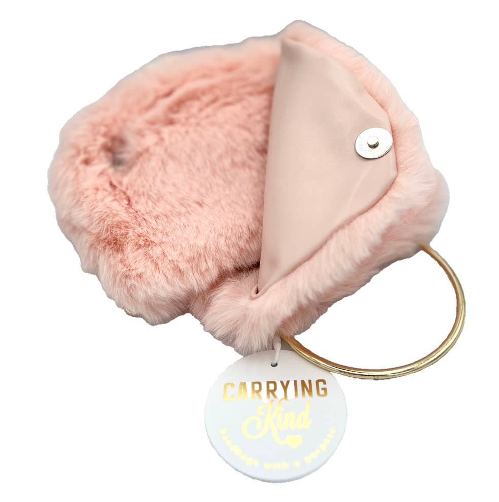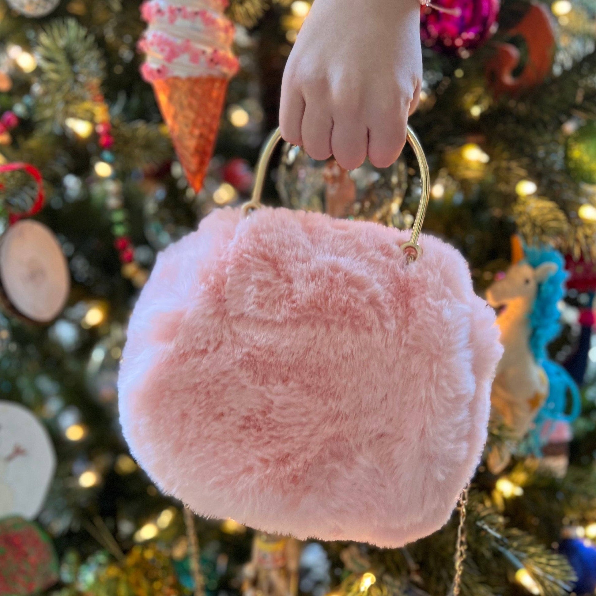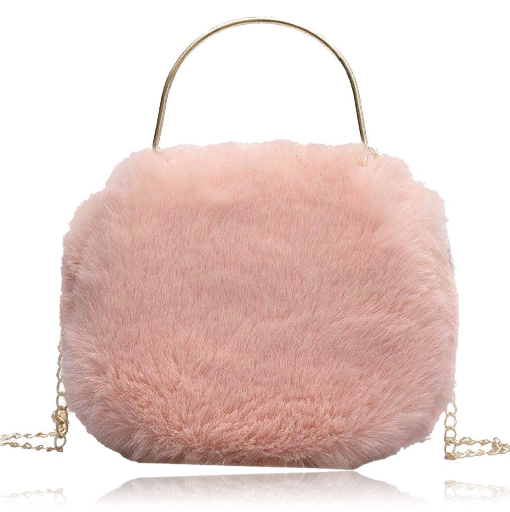 Lovie is as sweet as she is soft and beautiful. She is made of faux fur with color-coordinated vegan leather inner lining. Lovie is generously sized and sold with an attached gold handle as well as a lightweight gold chain removable cross-body strap.