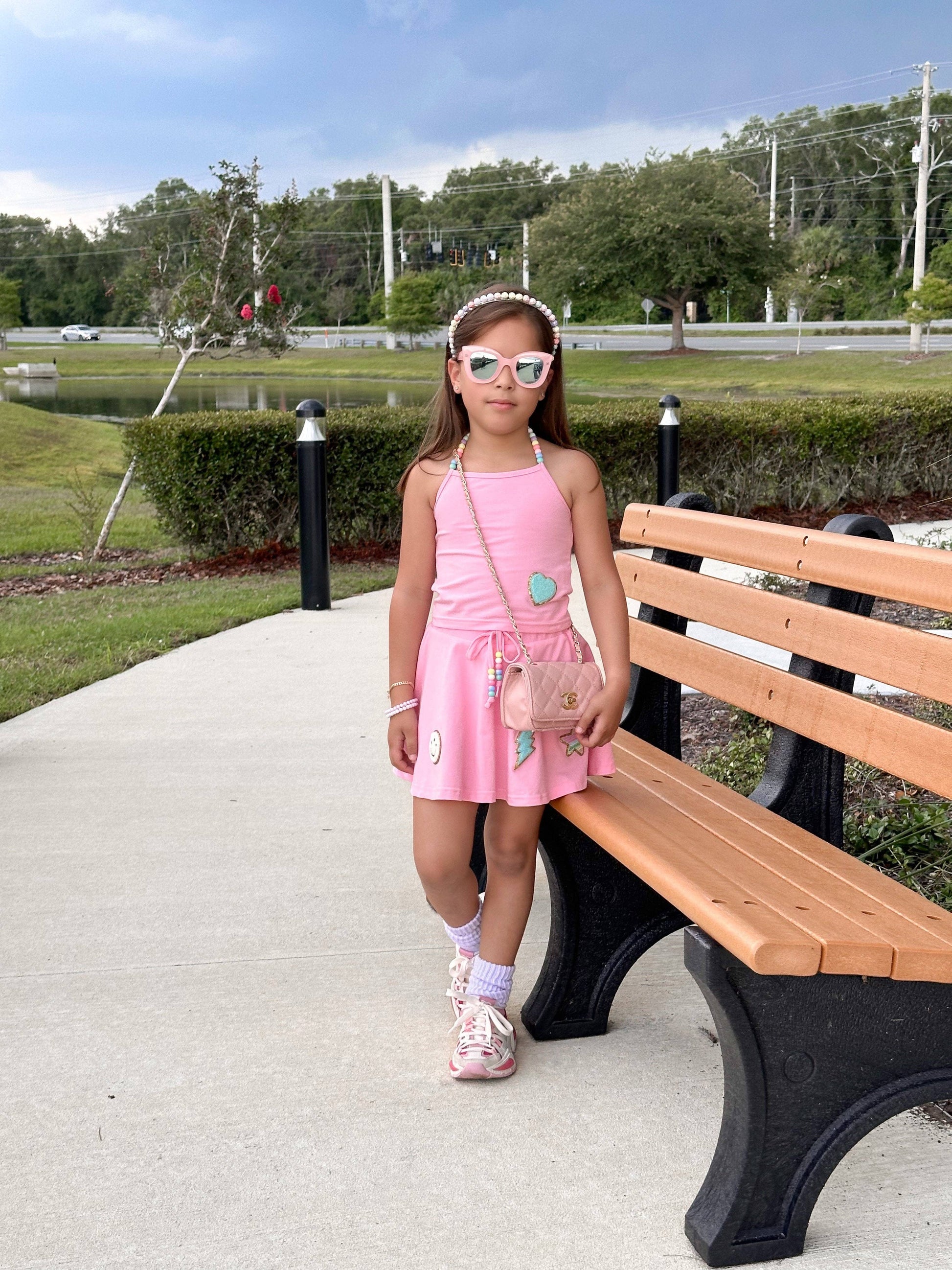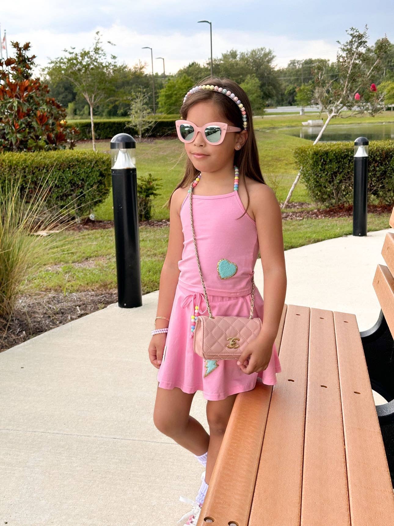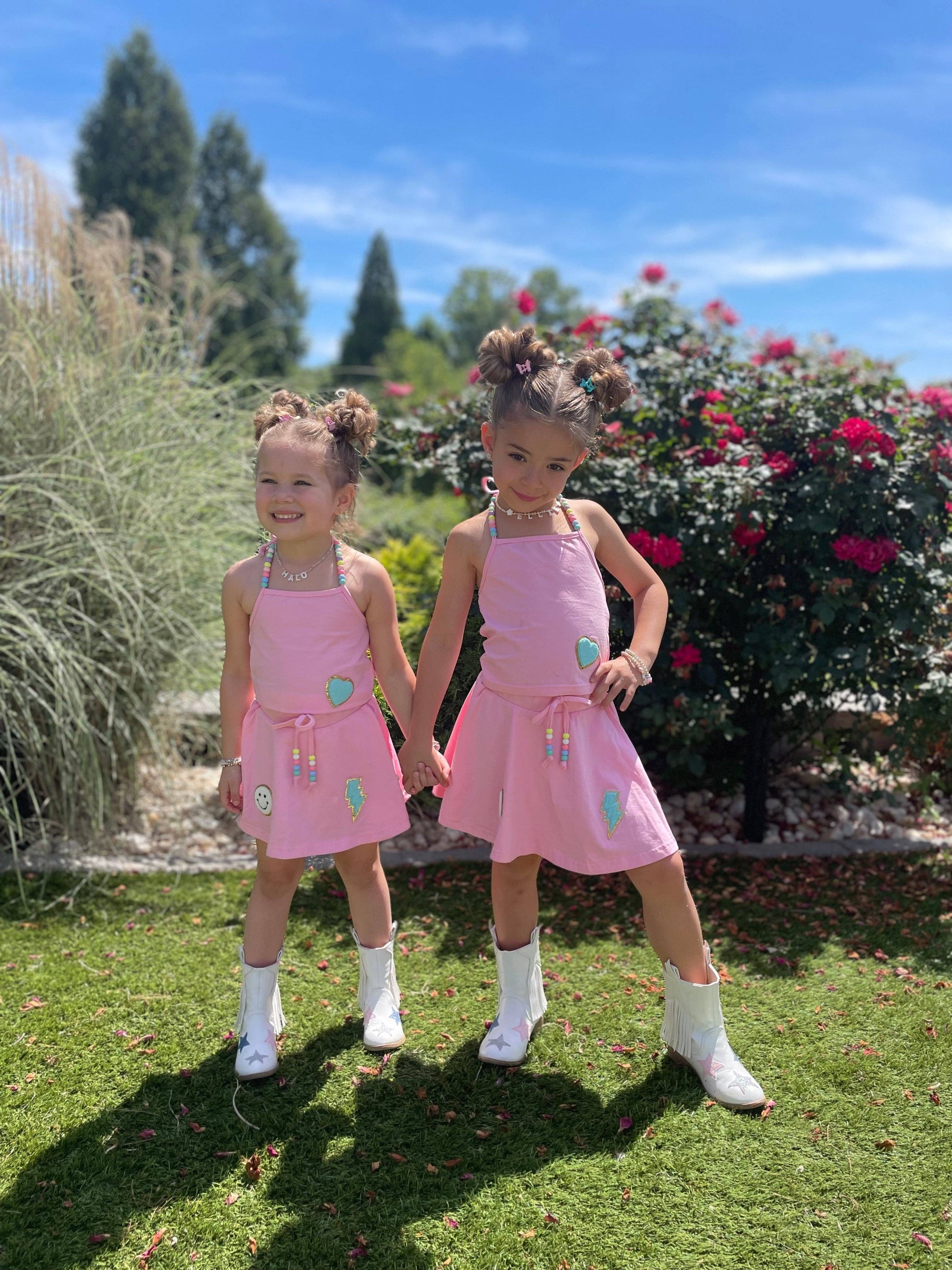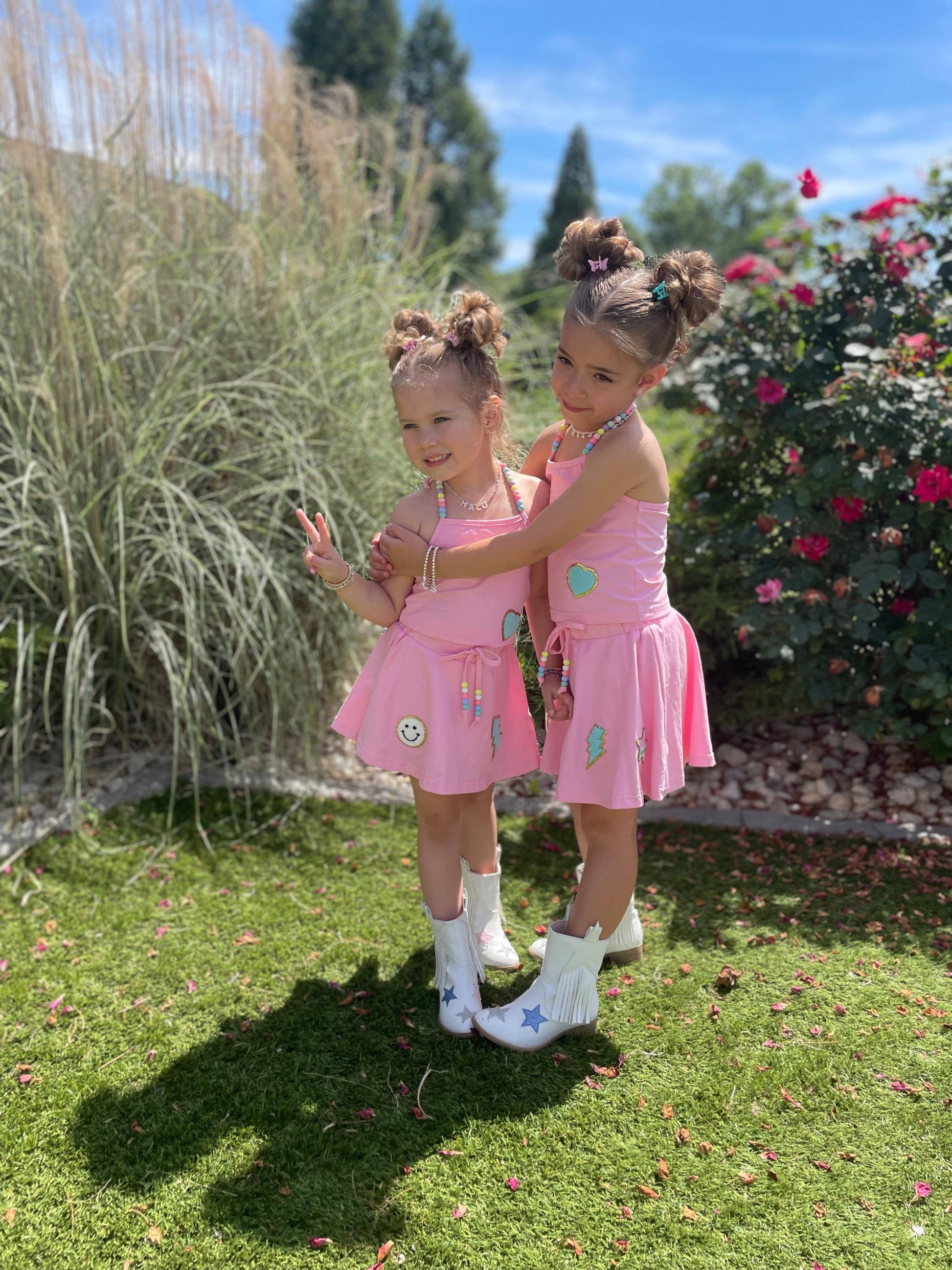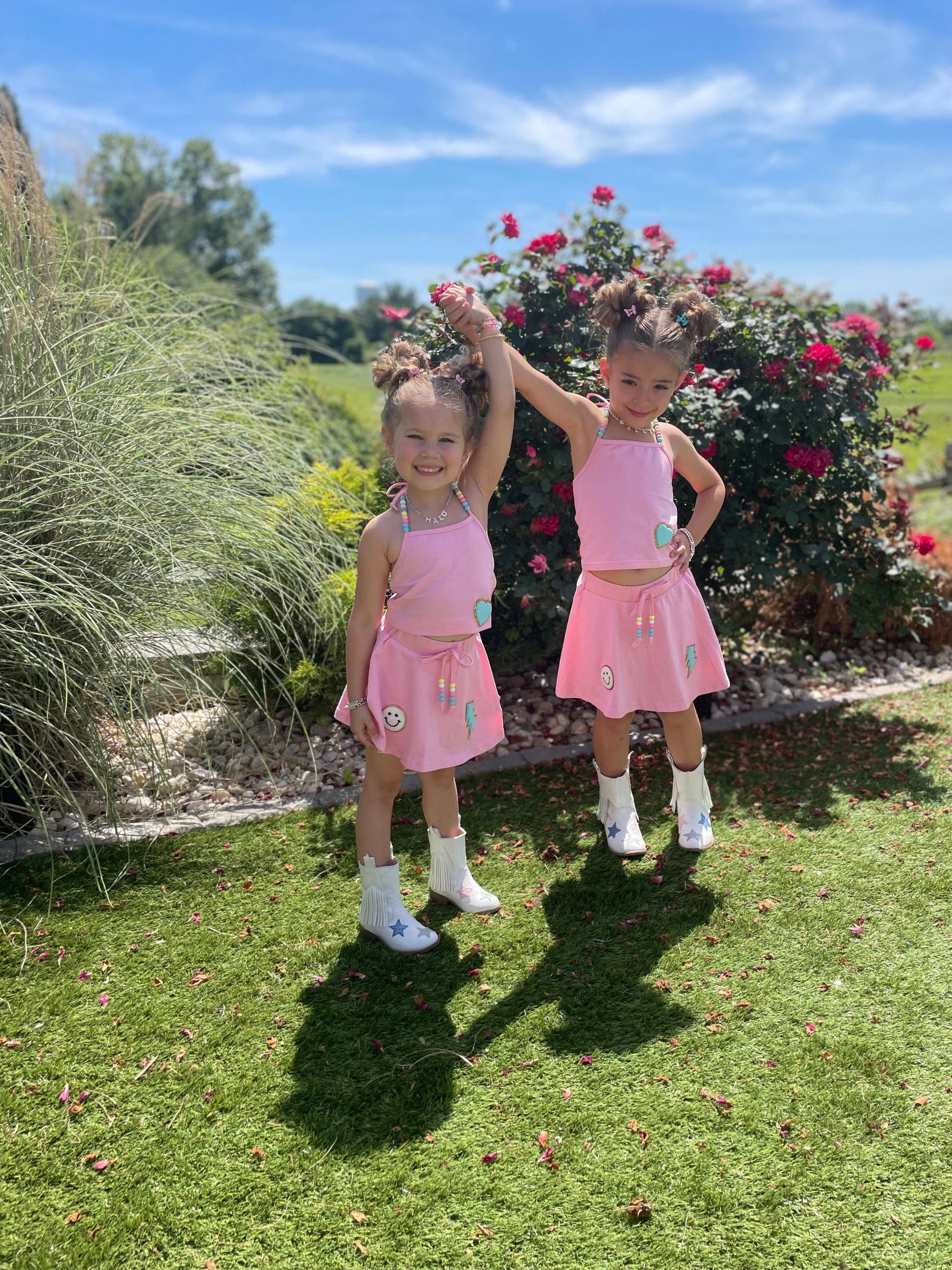 Check out our fun summer skort set! All patches are sewn on, and the pastel beads are the cutest addition! We've added shorts into the skirt for extra comfort. Soft and stretchy, this is the perfect set🩷Â