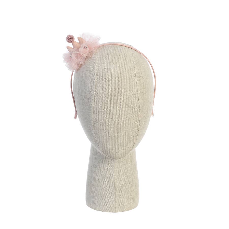 Pink plush princess crown with pom pom at the top. The crown has a tulle trim with one single silver thread holding pearl accents. It includes a flexible headband with silicon protectant at the ends for comfort.