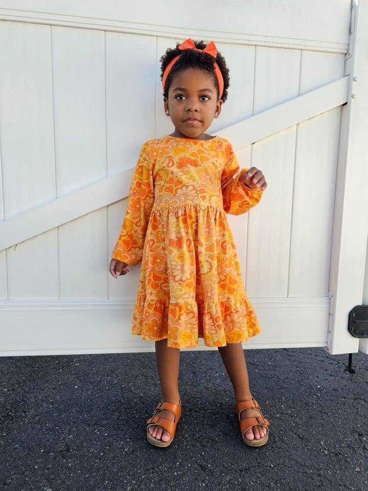 Set the mood for the new season in this cool retro boho long sleeve girls fall dress. Cool Groovy Style: A cool groovy print in warm fall colors on a 70s inspired silhouette brings retro style to her wardrobe.