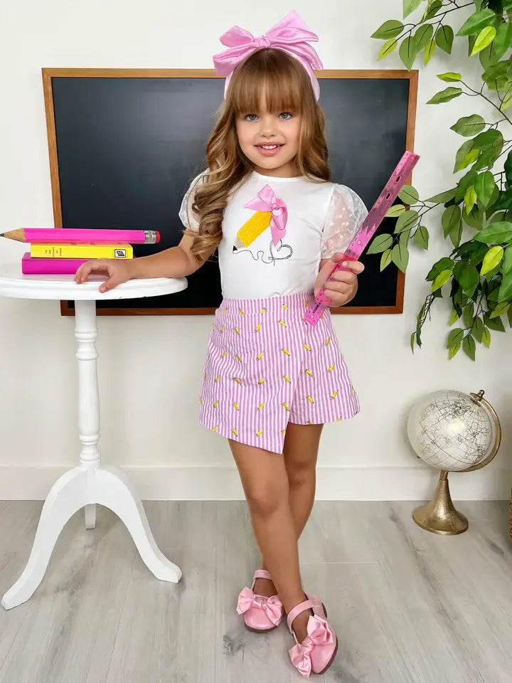 It's all about schoolgirl chic with our striped skort set. Puff sleeves on top with a classroom-ready bodice design and a cool-girl skort that give her extra style confidence in and out of halls. Soft fabric offers all-day comfort so she can stay focused and confident. No bunching and stuffiness! Pre-styled pieces are versatile and can be mixed and matched with other faves.