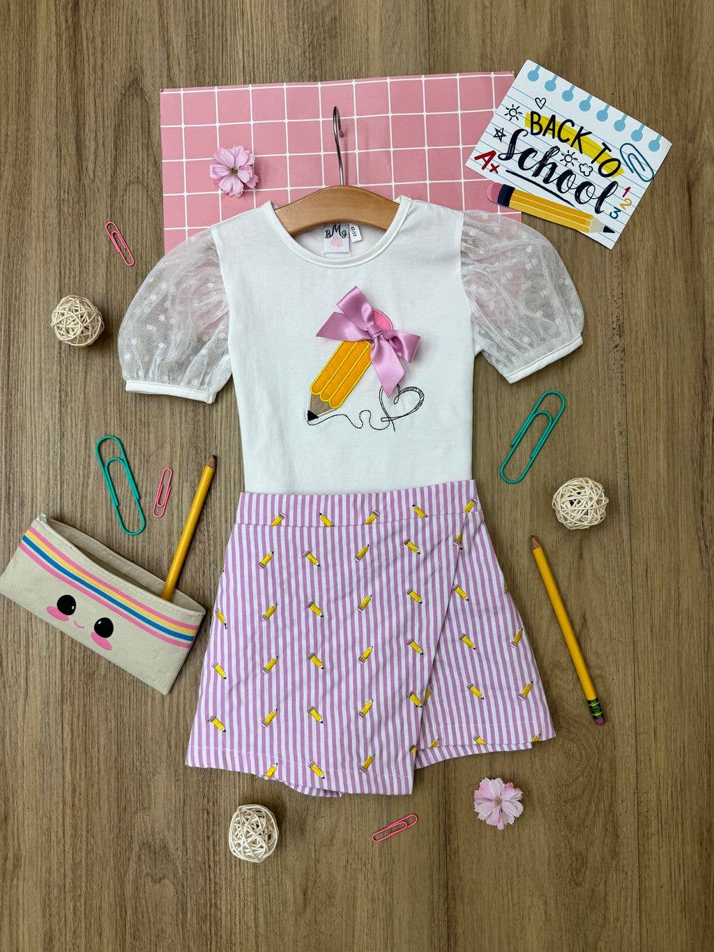 Schoolgirl Pencil Chic Puff Sleeve Top And Striped Skort Set