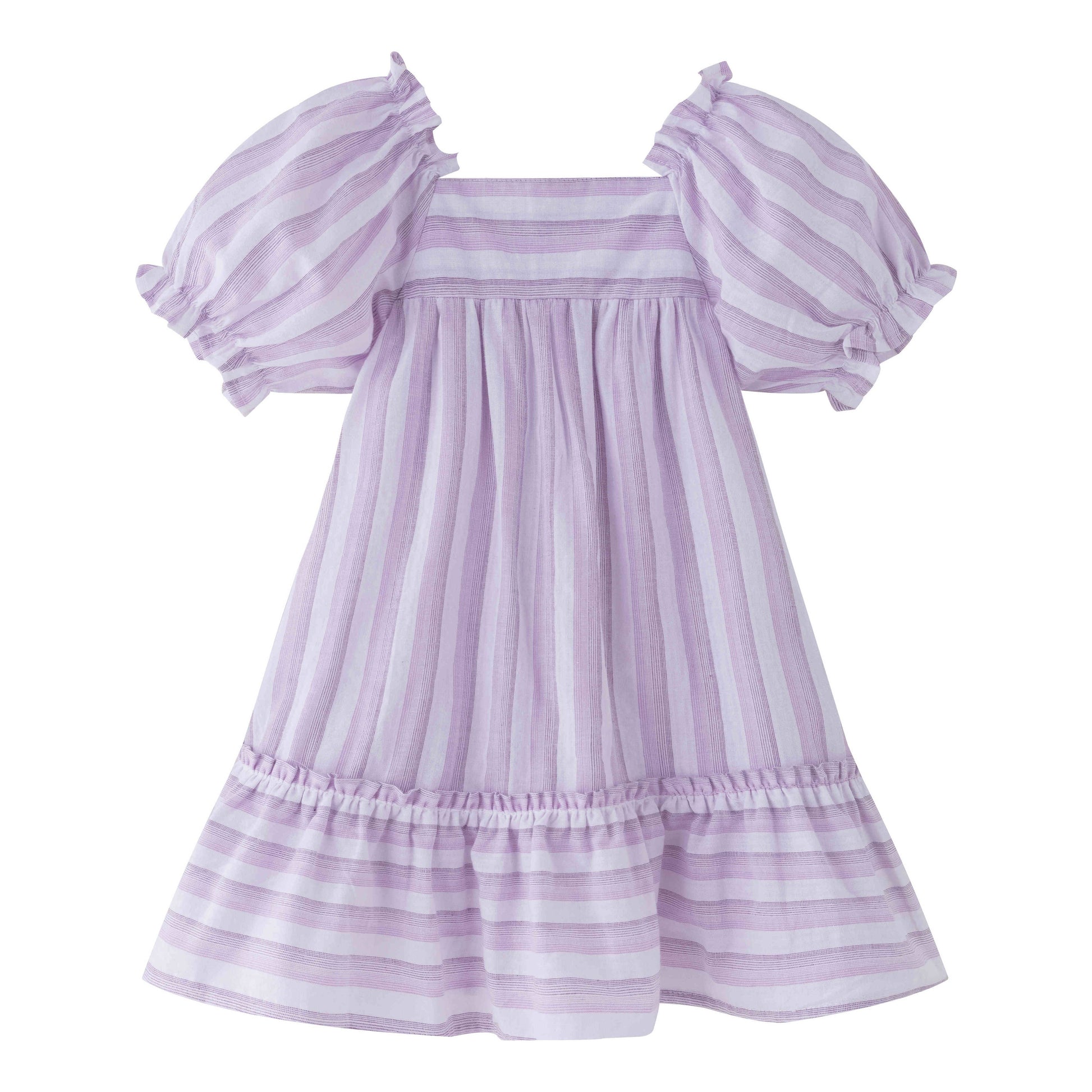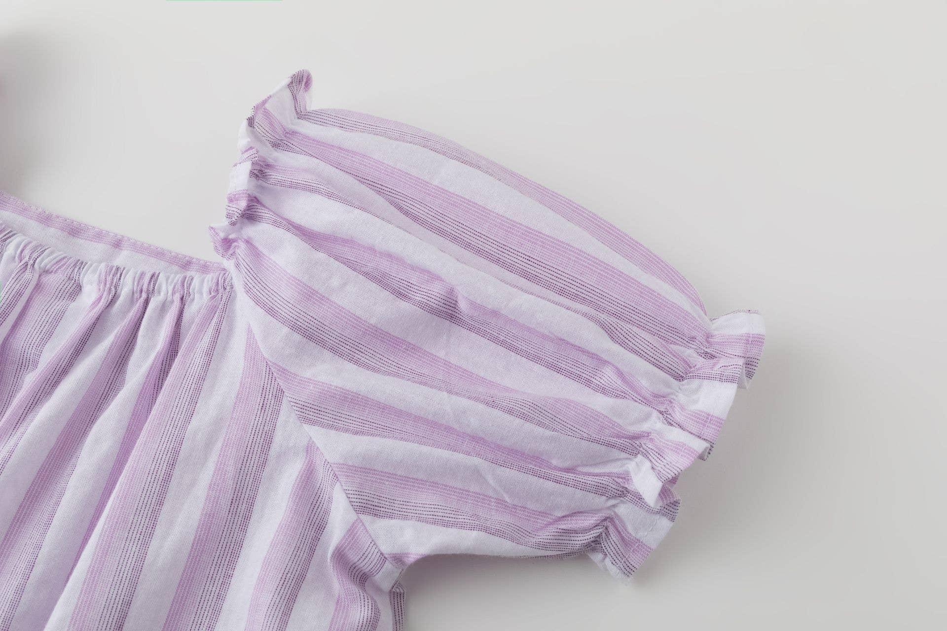 Girl's dress with gathered short sleeves, with elastic on the shoulder and cuffs Hip cut with small gathered ruffle in horizontal stripe fabric Mauve striped fabric, 100% cotton